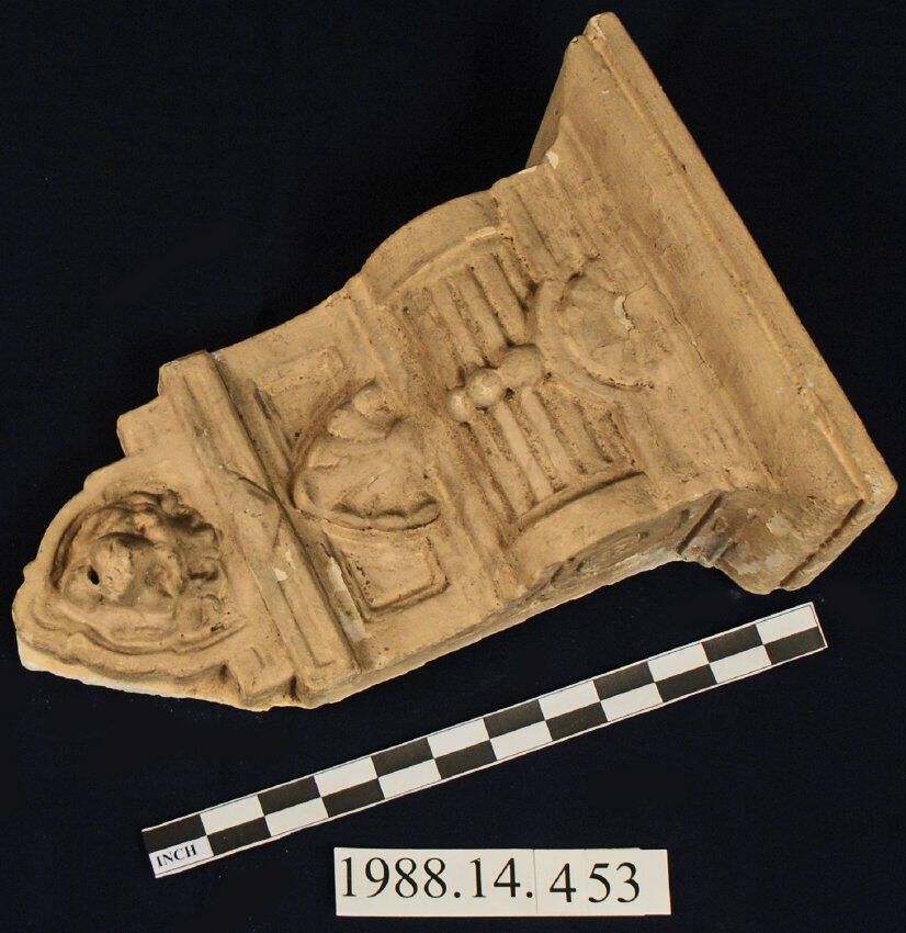 Historic plaster bracket. Classical Revival style. Rectangular top with molded edge. Demi-sunburst. Horizontal fluting. Below is stylized anthemion with horizontal bar. Pendant end with relief lion's head. Painted beige.