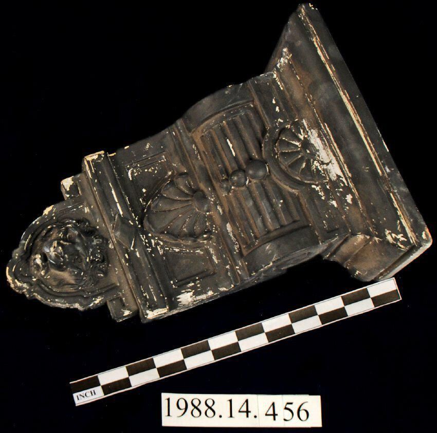 Historic plaster bracket. Classical Revival style. Rectangular top with molded edge. Demi-sunburst. Horizontal fluting. Below is stylized anthemion with horizontal bar. Pendant end with relief lion's head. Painted black.