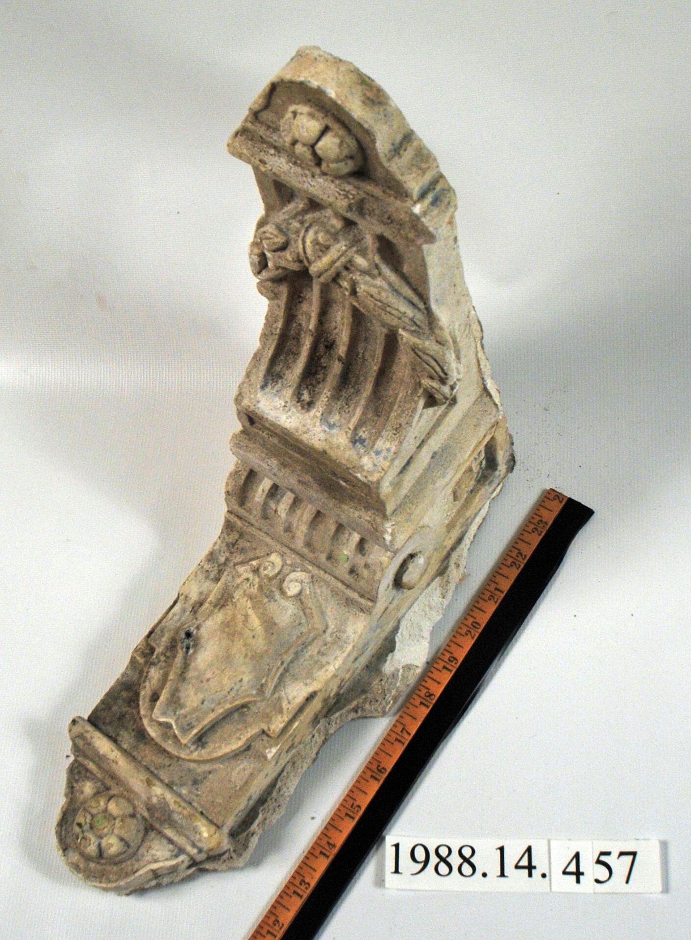 Historic plaster two piece L-shaped bracket. Upper horizontal piece has rosette molding. Shield-shaped cartouche. Vertical fluting. Side scrolls. Lower vertical piece has rectangular top with molded edge. Vertical fluting. Garland. Pendant end with rosette. Two separate pieces.