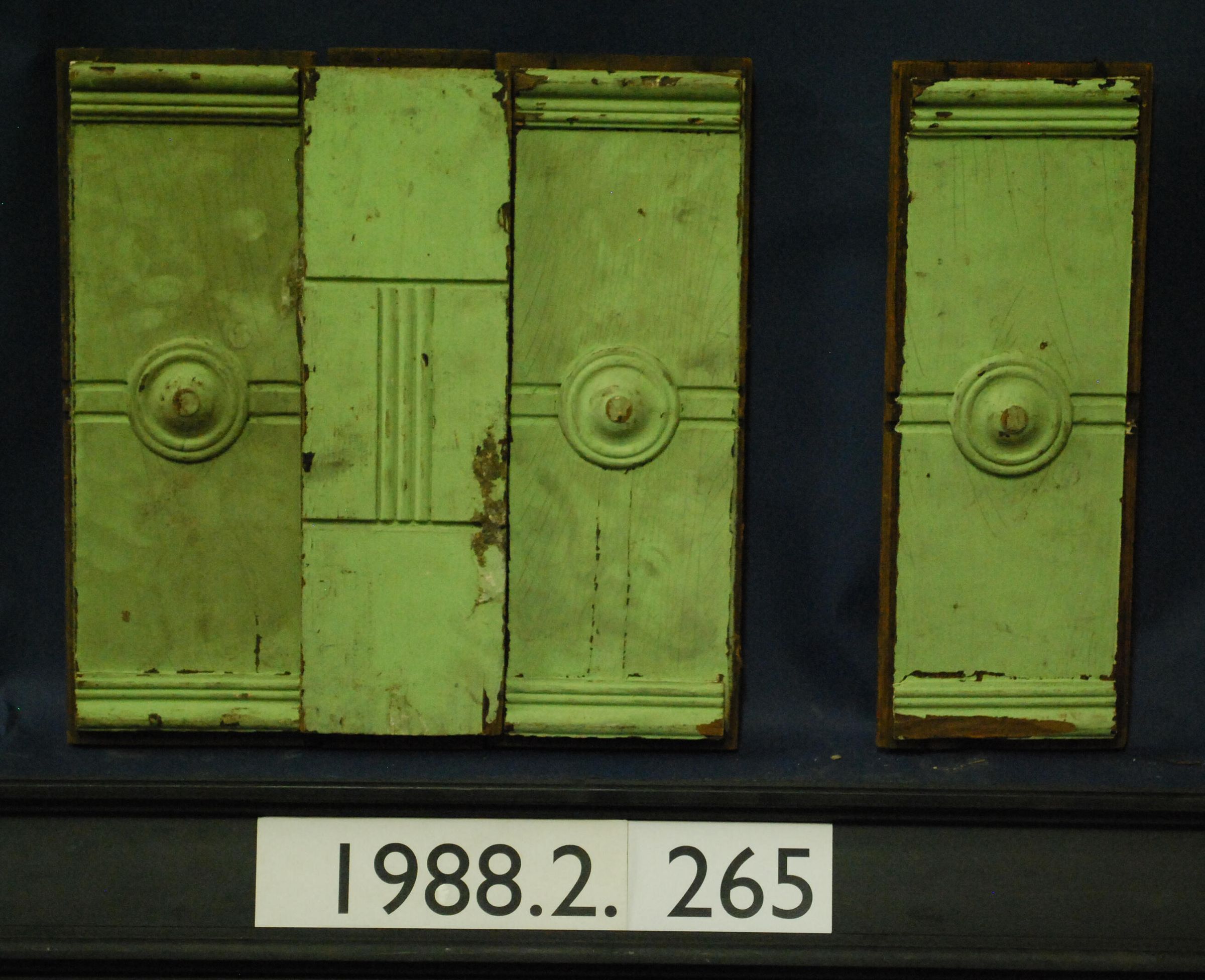 One lot of three door panels. Includes one stile. Each panel has applied moldings with bull's-eye on both sides. Originally part of a door. One side is painted green and the other side is varnished.