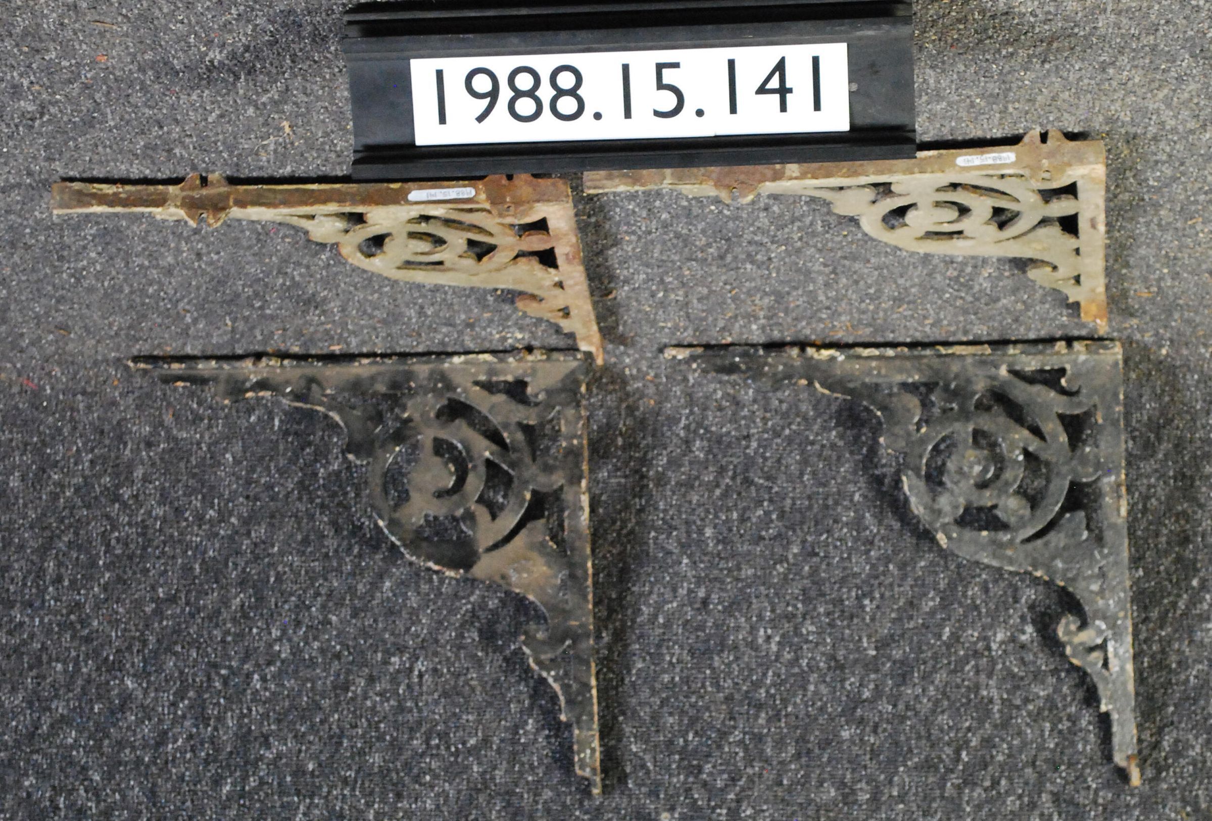 One lot of four cast iron brackets originally used to support plumbing fixture (sink). Two are painted black and two are painted brown.