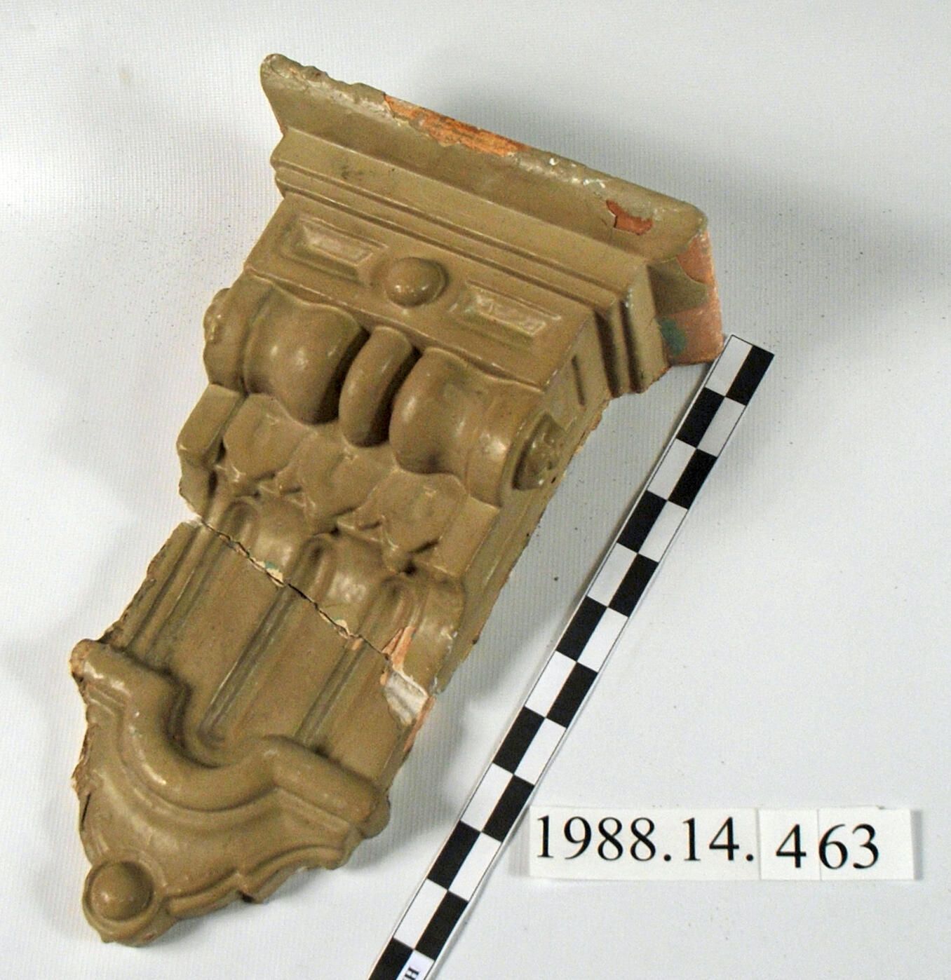 Historic plaster bracket. Rectangular top with molded edge. Recessed panels with central button. Turned reel with rosette on each side geometric, dart, vertical fluting. Pendant end with central button. Painted green. Broken into two pieces.
