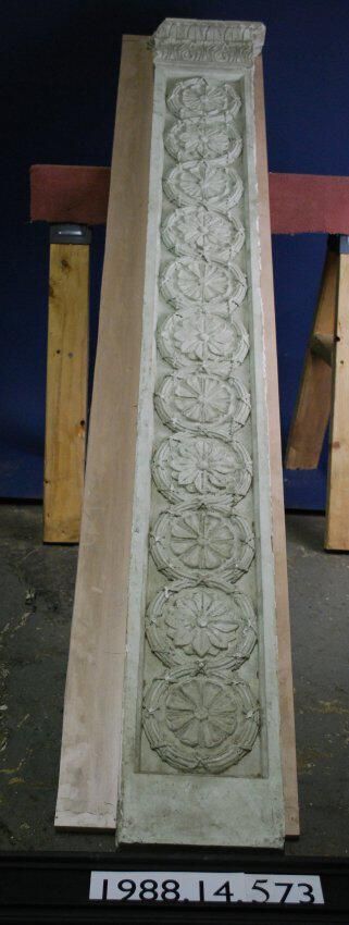 Historic plaster pilaster. Has capital, recessed panel with series of rosettes and intertwined motifs. Reverse is reinforced with steel channel and plant fibre. Painted light green.