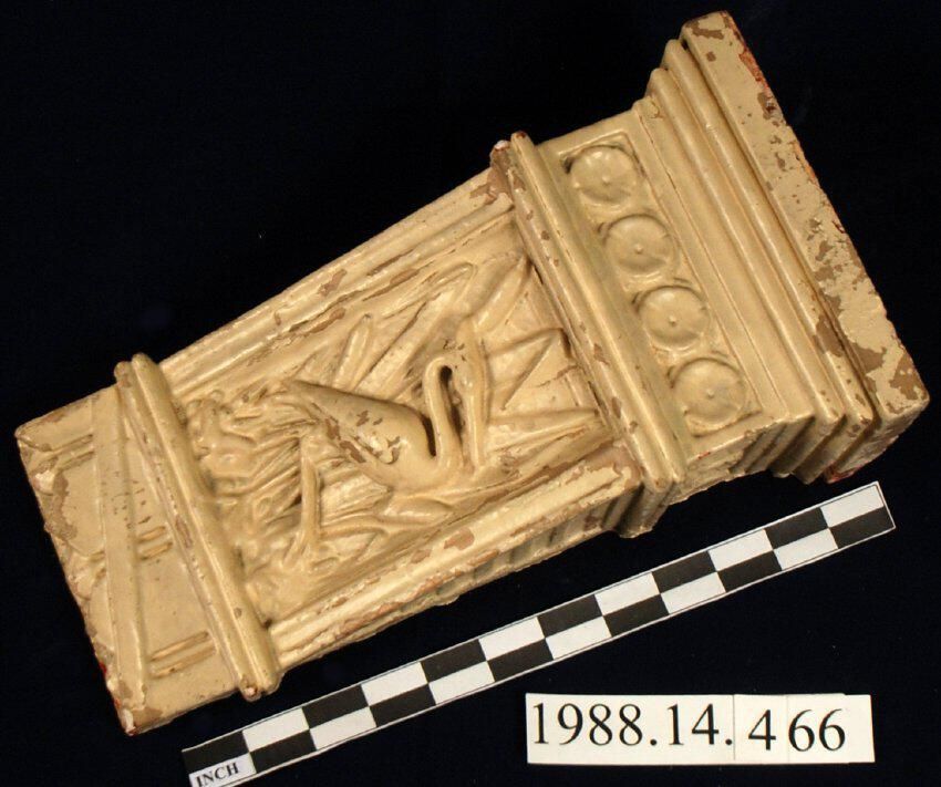 Historic plaster bracket. Rectangular top with molded edge. Series of rosettes within recess. Molded edge. Relief of crane bird with cattail motif. Ribbed sides . Lower end has diagonal banner and dart motif. Painted cream colored.