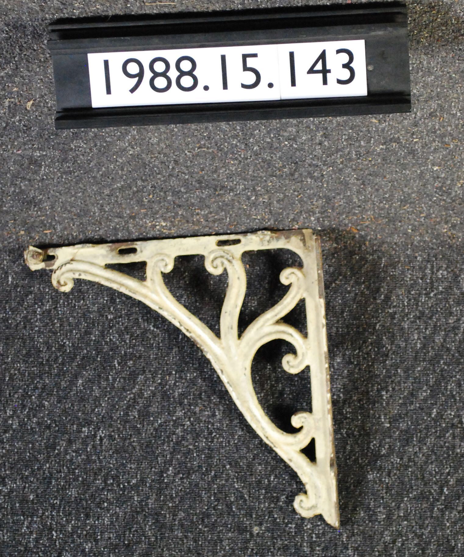 One cast Iron bracket. Originally used to support plumbing fixture (sink). Painted white. Inscriptions or Markings: Manufacturer: Place of Manufacture: Design motif: Style: Finish: Painted White