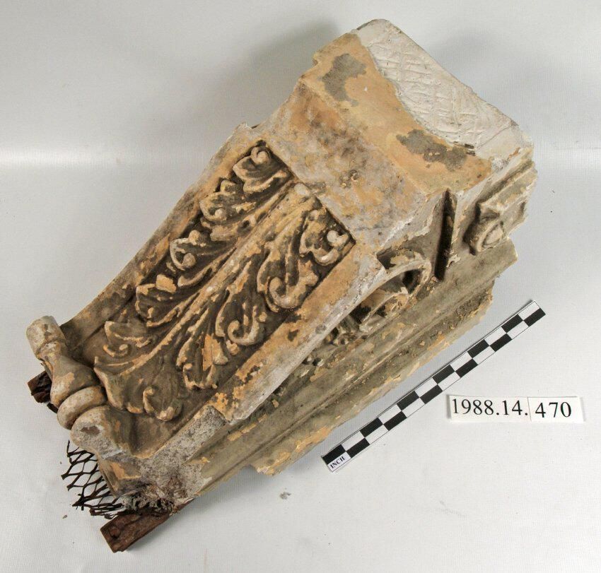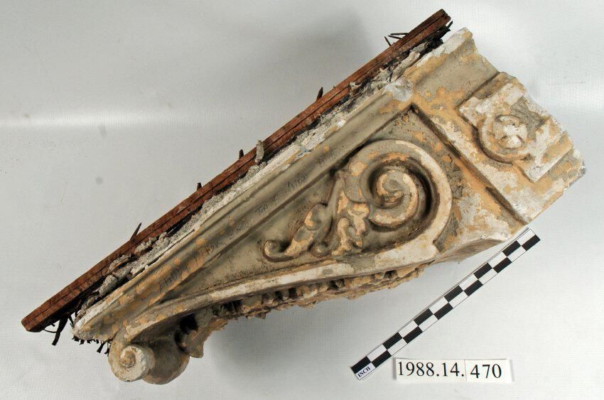 Historic plaster bracket from top of column in main lobby of Ladd and Tilton bank. Horizontal orientation. Acanthus leaf motif, scrolled foliated sides, turned reel end, broken corner, painted beige. Hollow construction. Expanded Iron and wood lath mounted with wire nails on back. Original bank built 1868 -- this piece probably from later remodel.