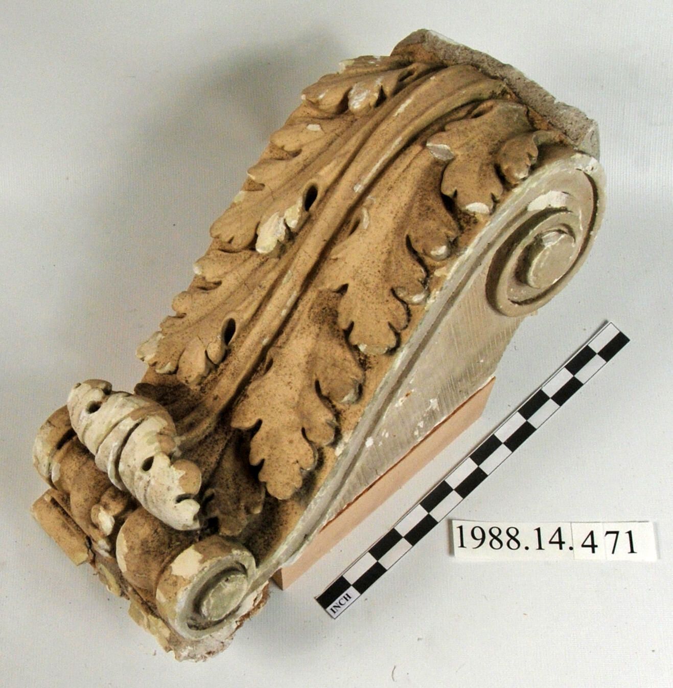 Historic plaster bracket. Open top. Scrolled acanthus leaf motif. Scrolled sides. Contoured reel Lower end. Painted beige. Hollow construction. Reinforced with plant fibre.