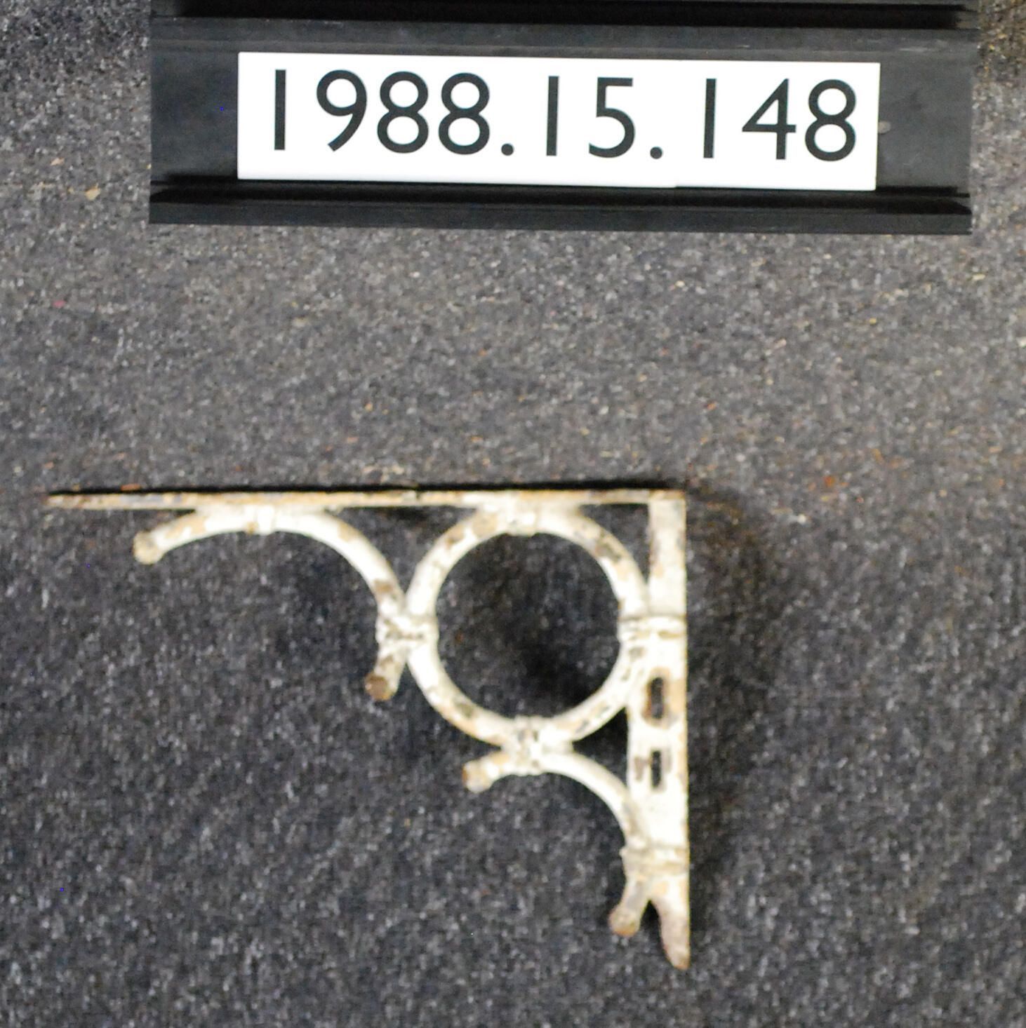 One cast Iron bracket. Originally used to support plumbing fixture (sink) or toilet tank. Painted white. Inscriptions or Markings: Manufacturer: Place of Manufacture: Design motif: Style: Finish: Painted White