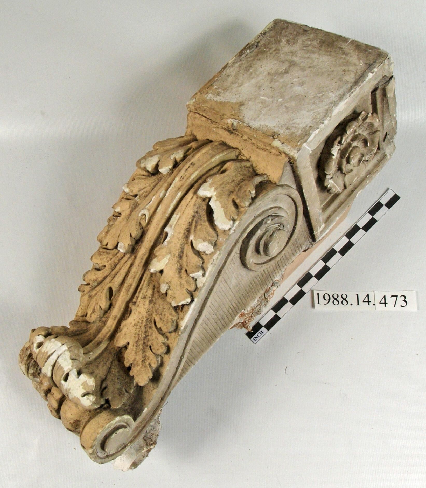 Historic plaster bracket. Rectangular. Open cube. Top with rosette on each side. Below is scrolled ancanthus leaf motif. Scrolled sides. Turned reel lower end. Painted beige. Hollow construction. Reinforced wth plant fibre. Wire nails inserted in back.