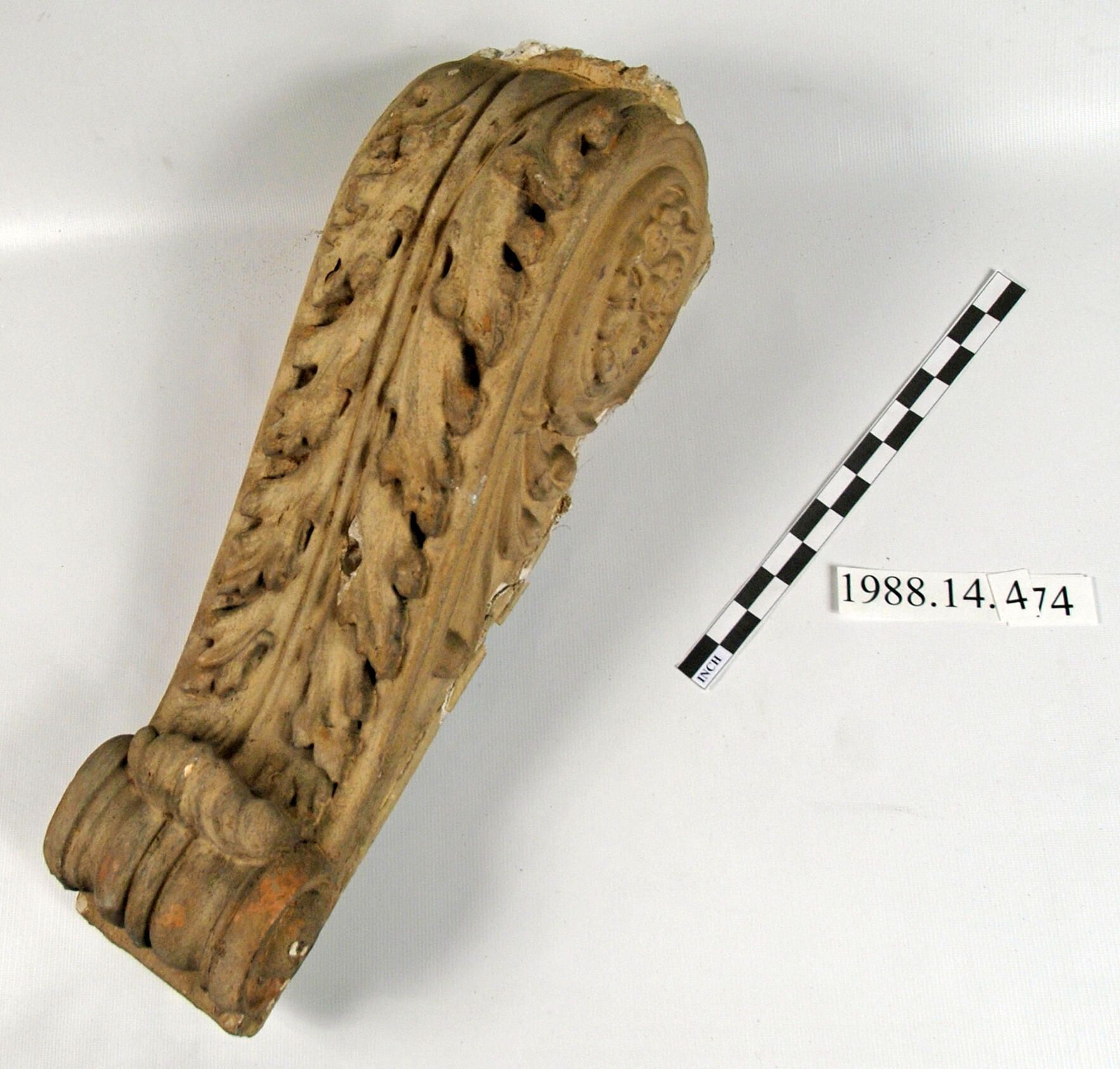 Historic plaster bracket. Rectangular. Open top. Ancanthus leaf motif with scrolled end. Scrolled sides with rosette. Painted beige. Hollow construction. Reinforced with plant fibre and stick. Has wire nails inserted in back.