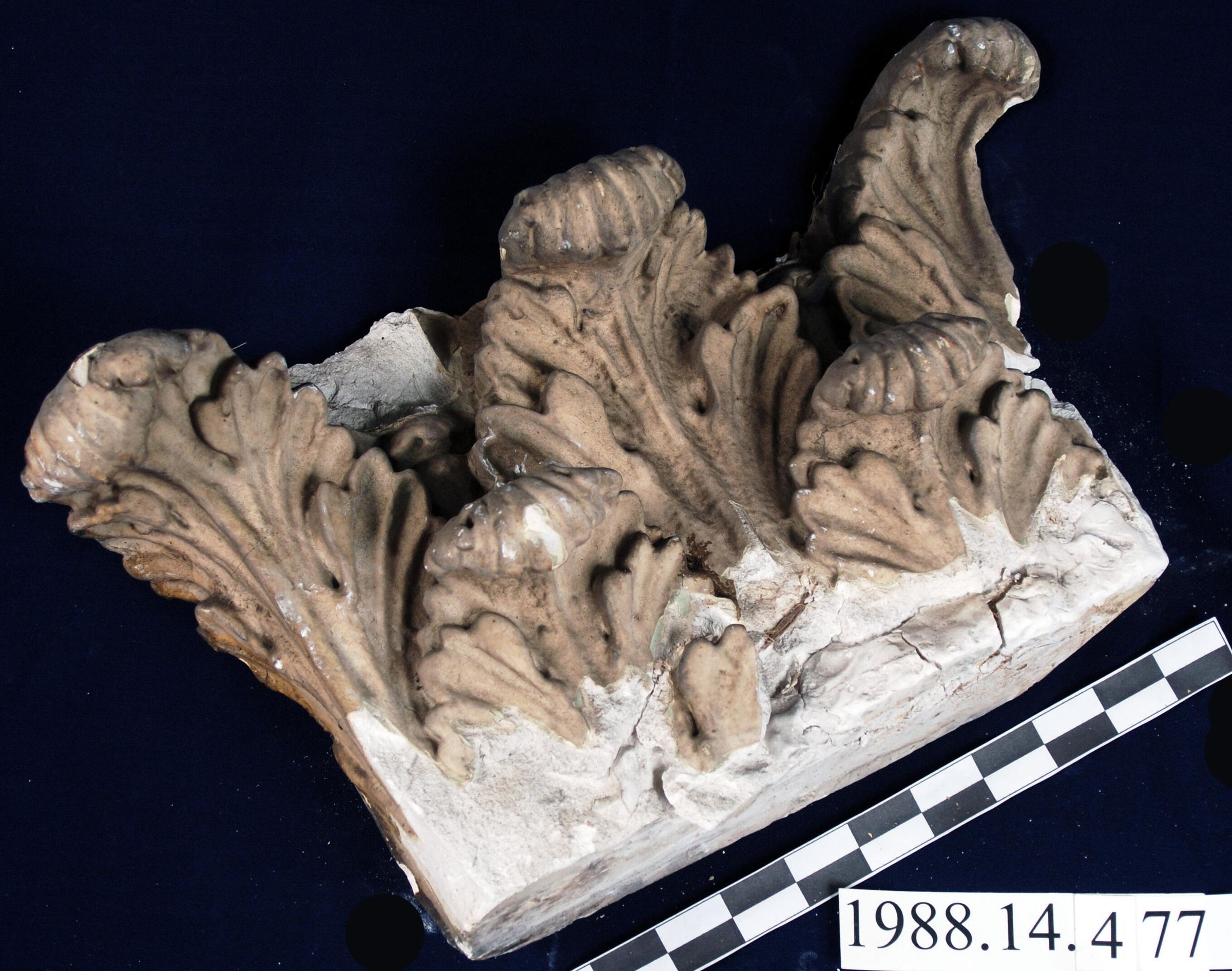 Historic plaster capital. Multiple ancanthus leaf motif. Corinthian order. Mitred corner, Painted beige. Reinforced with plant fibre. Chipped. Damaged.