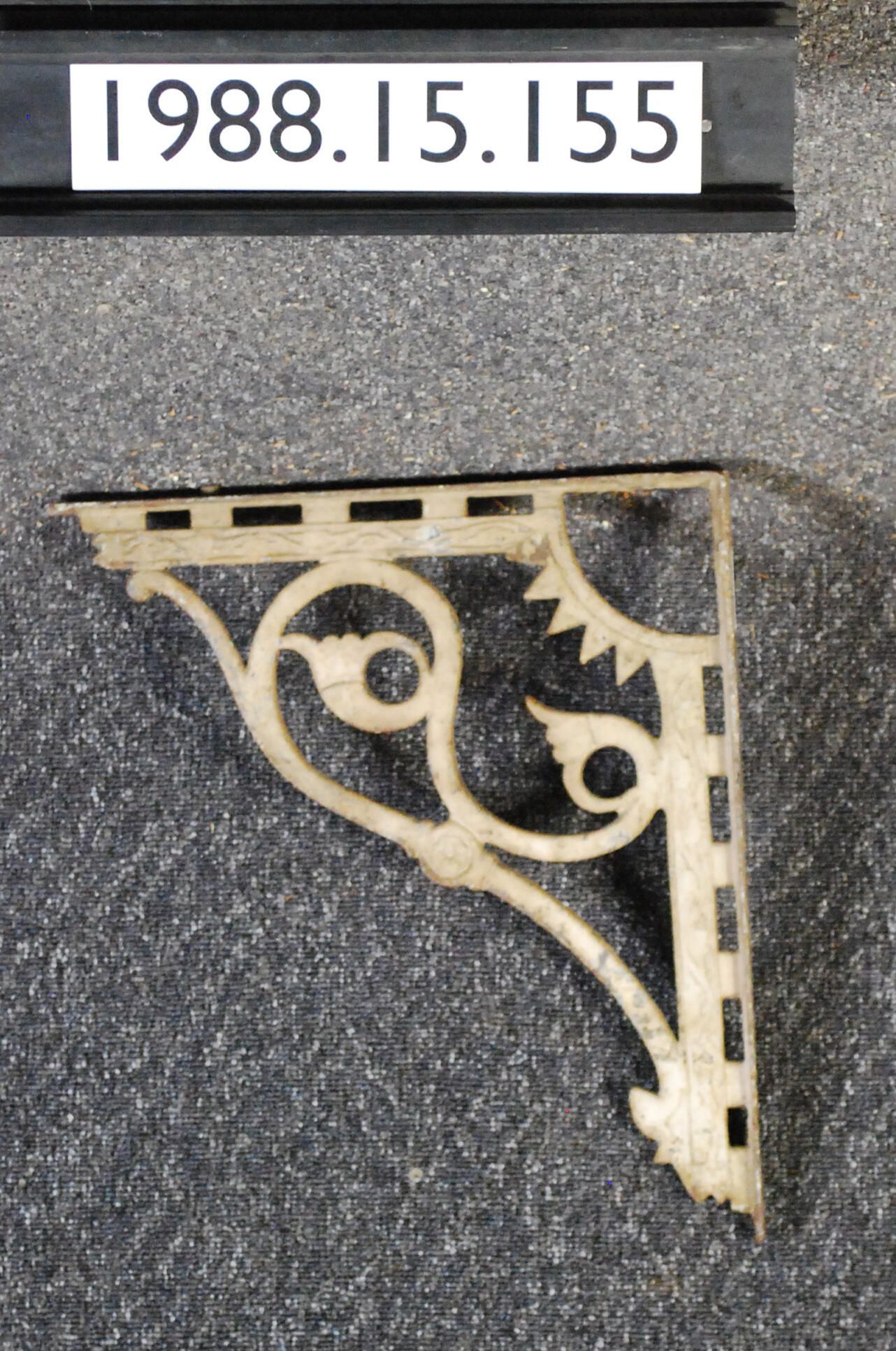 One cast iron bracket. Originally used to support plumbing fixture (sink). Painted beige. Inscriptions or Markings: Manufacturer: Place of Manufacture: Design motif: Style: Finish: Painted Beige