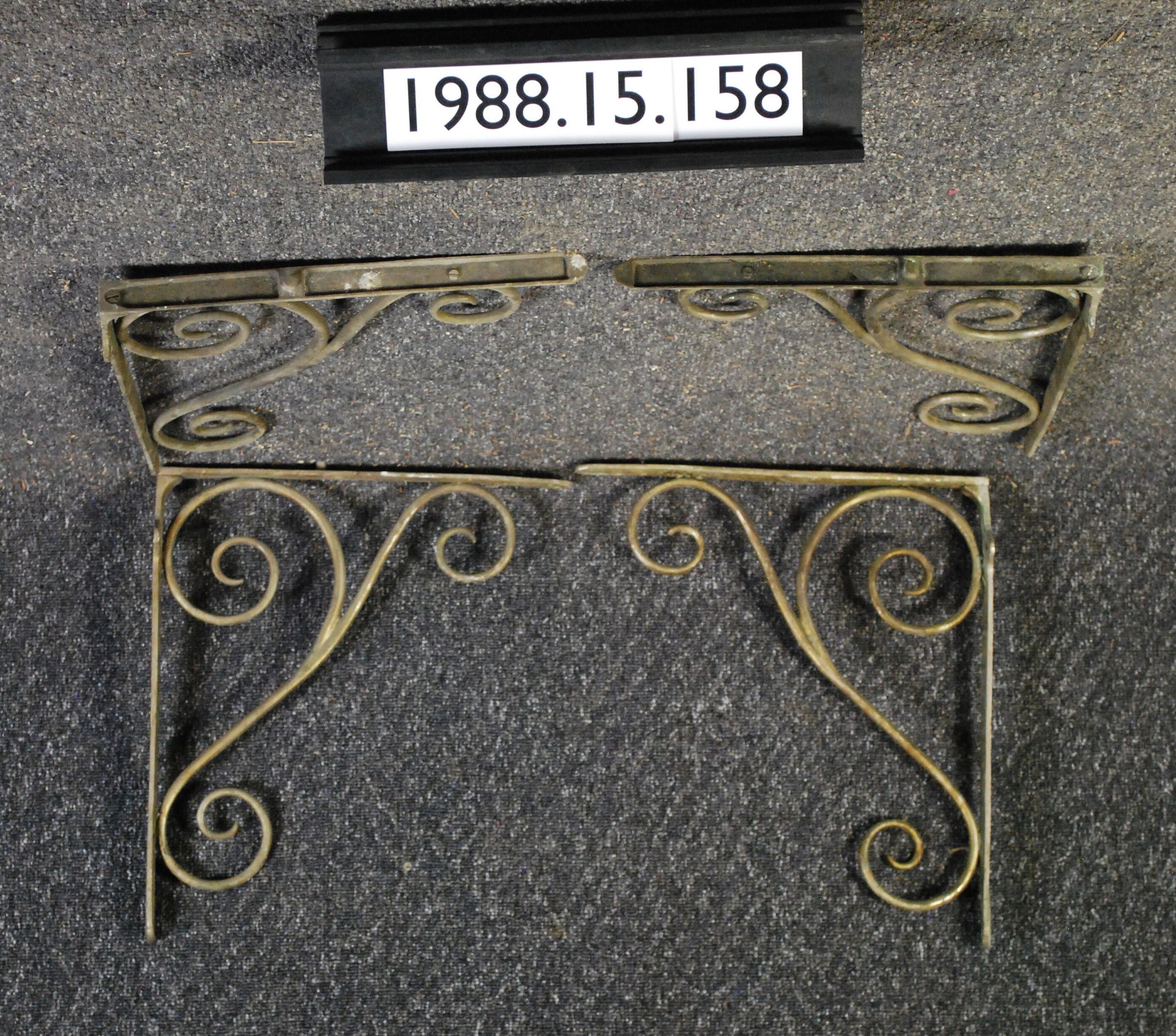 One lot of four brass brackets. Originally used to support plumbing fixture (sink). Nickle plated finish. Inscriptions or Markings: Manufacturer: Place of Manufacture: Design motif: Style: Finish: Nickle Plated