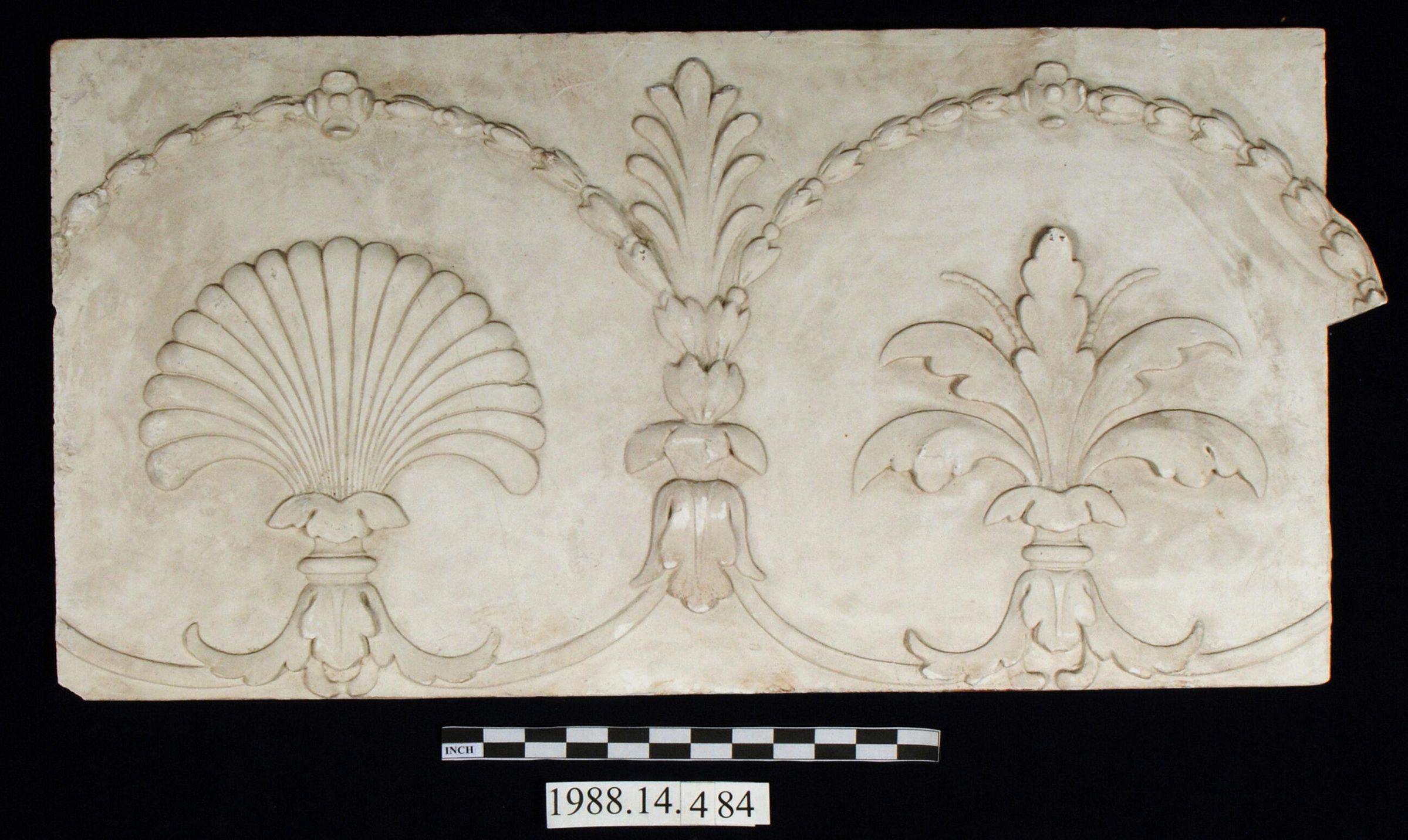 Historic plaster frieze panel. Rectangular. Has repeating garlands. Three palmette motifs, and other botanical motifs. Panel has cracks. Reverse has incised score marks.