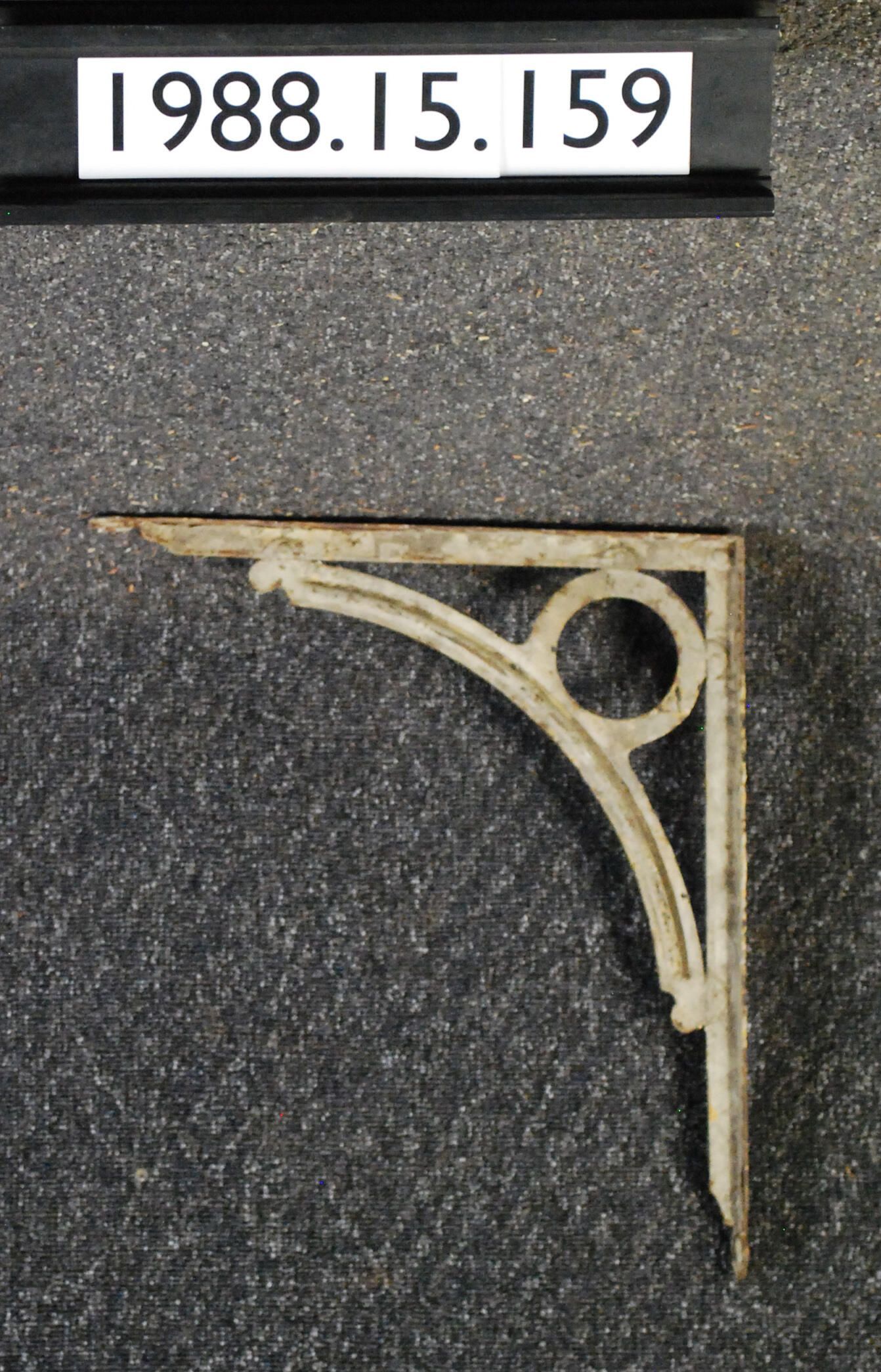 One die-stamped steel bracket. Originally used to support plumbing fixture (sink). Painted green. Inscriptions or Markings: Manufacturer: Place of Manufacture: Design motif: Style: Finish: Painted Green