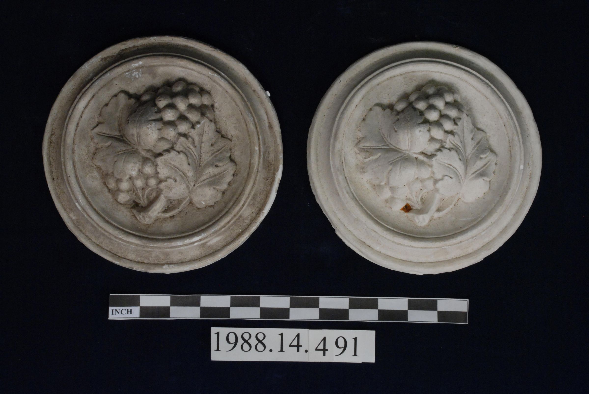 Reproduction molded plaster. Two circular ornaments with grape and grape leaf motif. Cast from flue stopper pattern. Wire loop fastener on back.