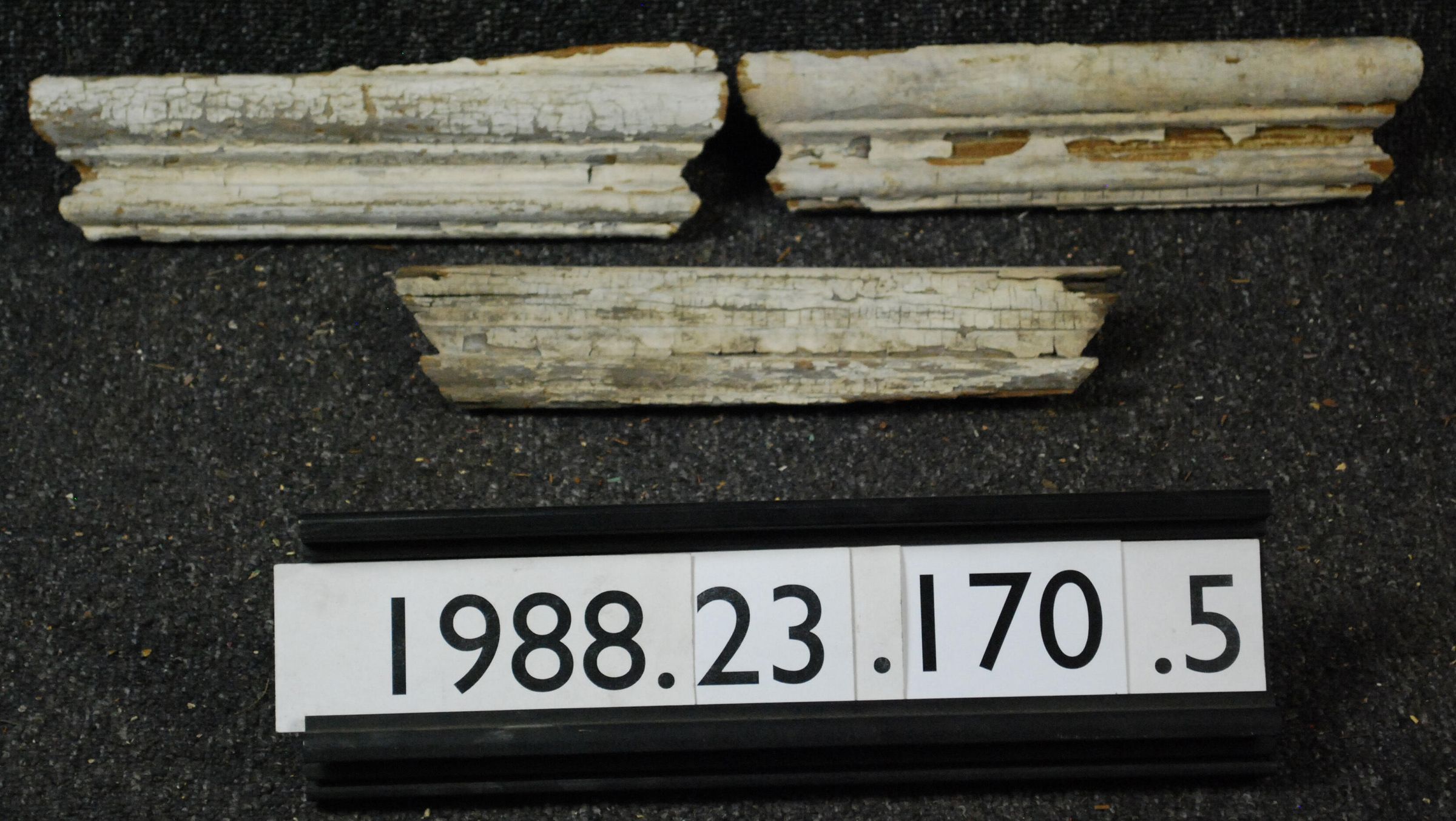 One lot of three exterior wood moldings. Mitre-cut at both ends. Painted white. Same white paint as 1988.23.170-1988.170.4. Manufacturer: Place of Manufacturer: Design motif: Style: Finish: Painted White