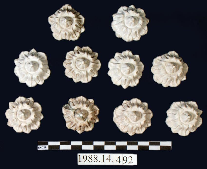 Reproduction molded plaster. Ten circular roseettes. Botanical motif.