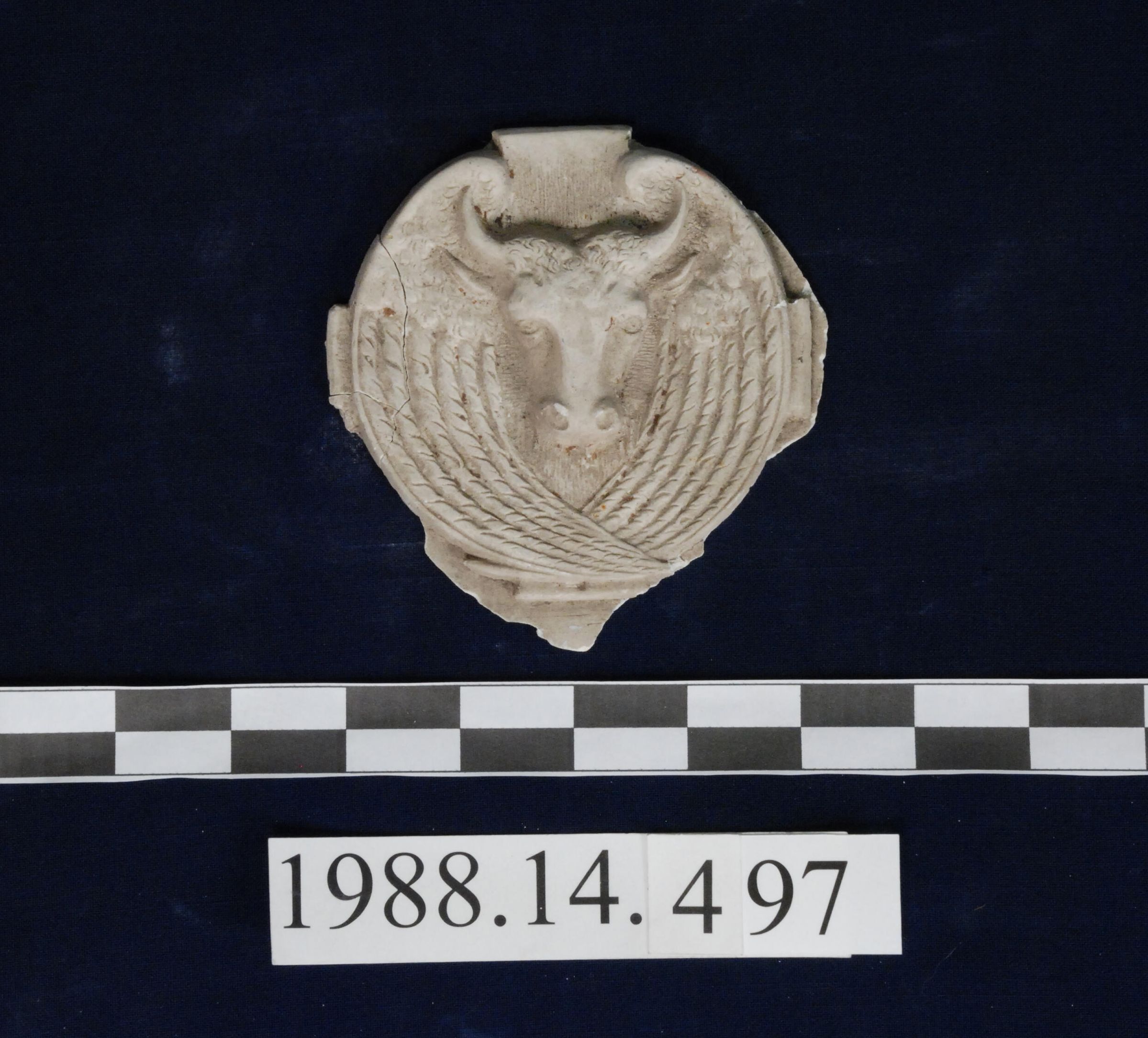 Reproduction molded plaster. One semi-circular ornament (broken into multiple pieces). Steel and wings motif.