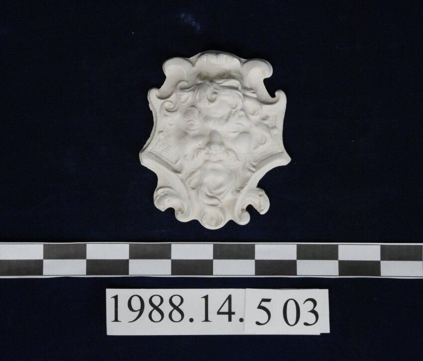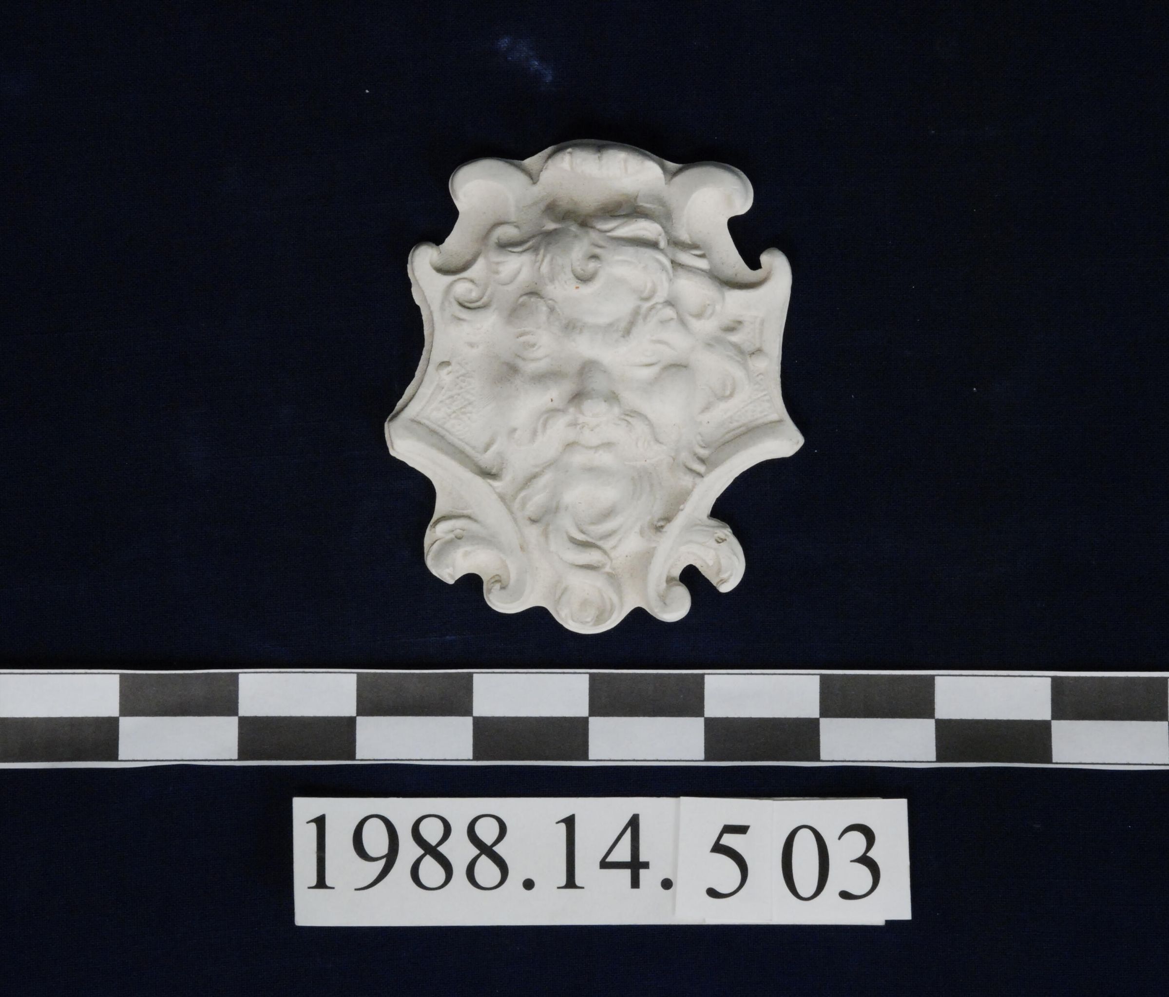 Reproduction molded plaster. Bearded figure surrounded by scrolls. (Grotesque figure).