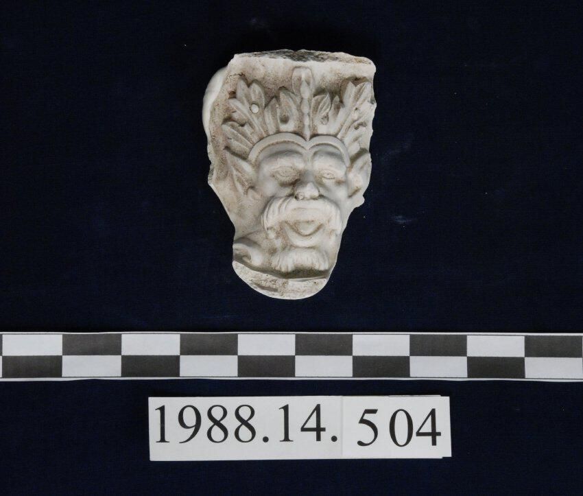 Reproduction molded plaster. Grotesque figure with pointed ears. Leaves for hair, gotee and mustache.