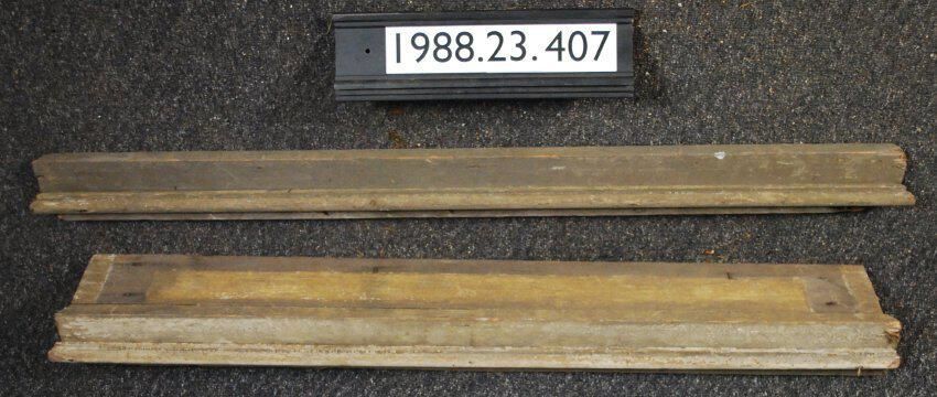 Pair of wood components - possibly exterior window casing or header. Remnants of paint. Inscriptions or Markings: Manufacturer: Place of Manufacturer: Design motif: Style: Finish: Remnants of Paint