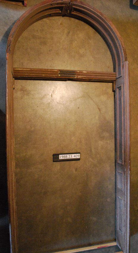 Exterior wood arched entry doorway assemblage. Has transom opening. Applied moldings (upper moldings are missing. Inside has paneled edges. Painted brown.