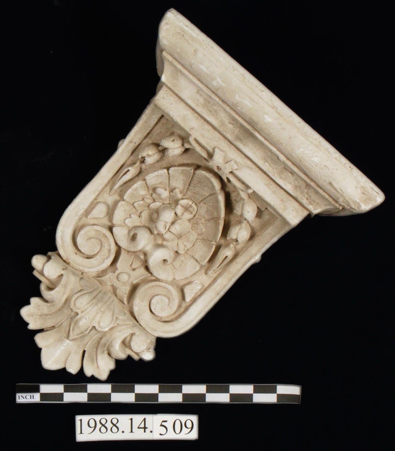 Reproduction molded plaster bracket. Scroll botanical / scalloped shell motif. Foliated pendant. Wire loop fastener on back.