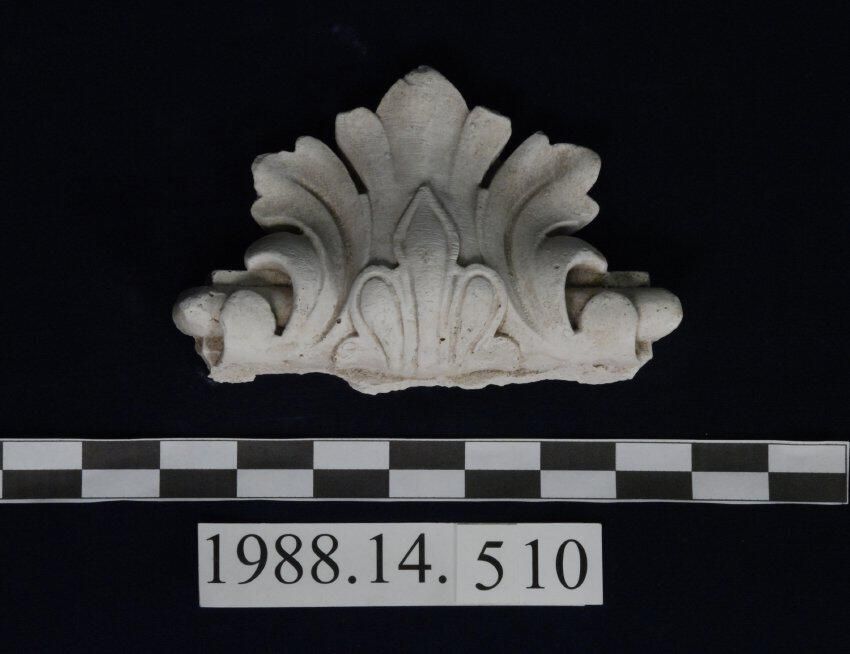 Reproduction molded plaster bracket. Lower end fragment. Foliated pendant.