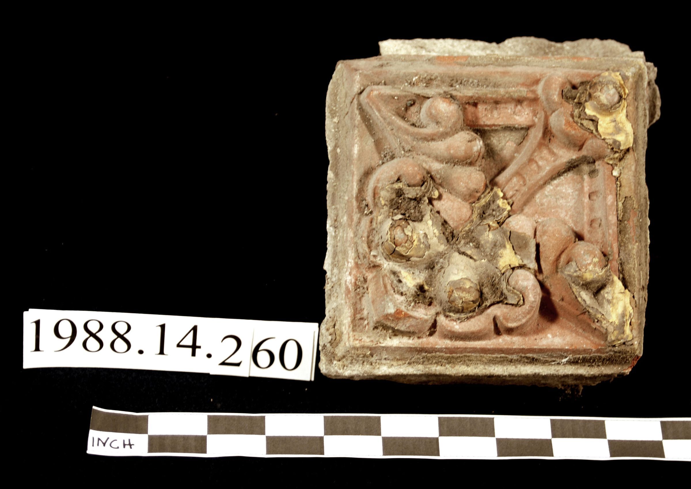 Molded red unglazed terra cotta block. Approximately 6 inch by 6 inch module. Botanical motif. Remnants of layers of paint (yellow and brown). Reverse is hollow. Filled with mortar. Originally mounted on brick wall.
