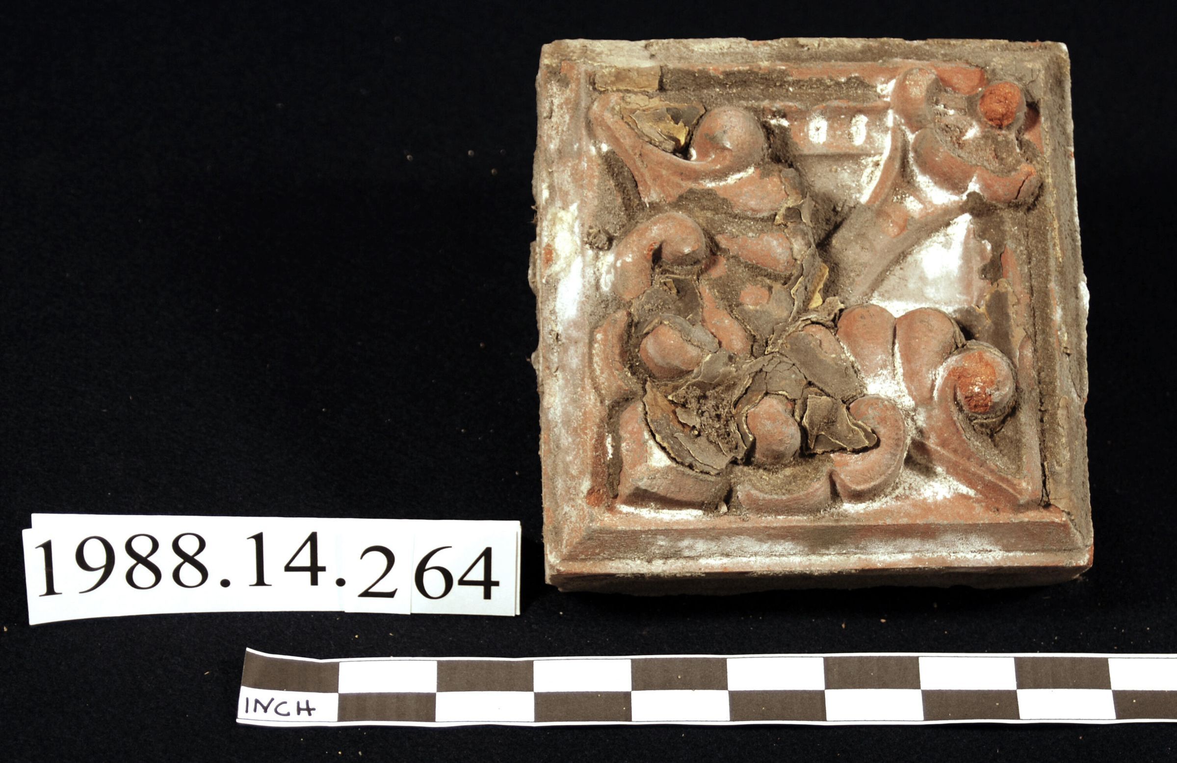 Molded red unglazed terra cotta block. Approximately 6 inch by 6 inch module. Botanical motif. Remnants of layers of paint (yellow and brown). Reverse is hollow. Filled with mortar. Originally mounted on brick wall.