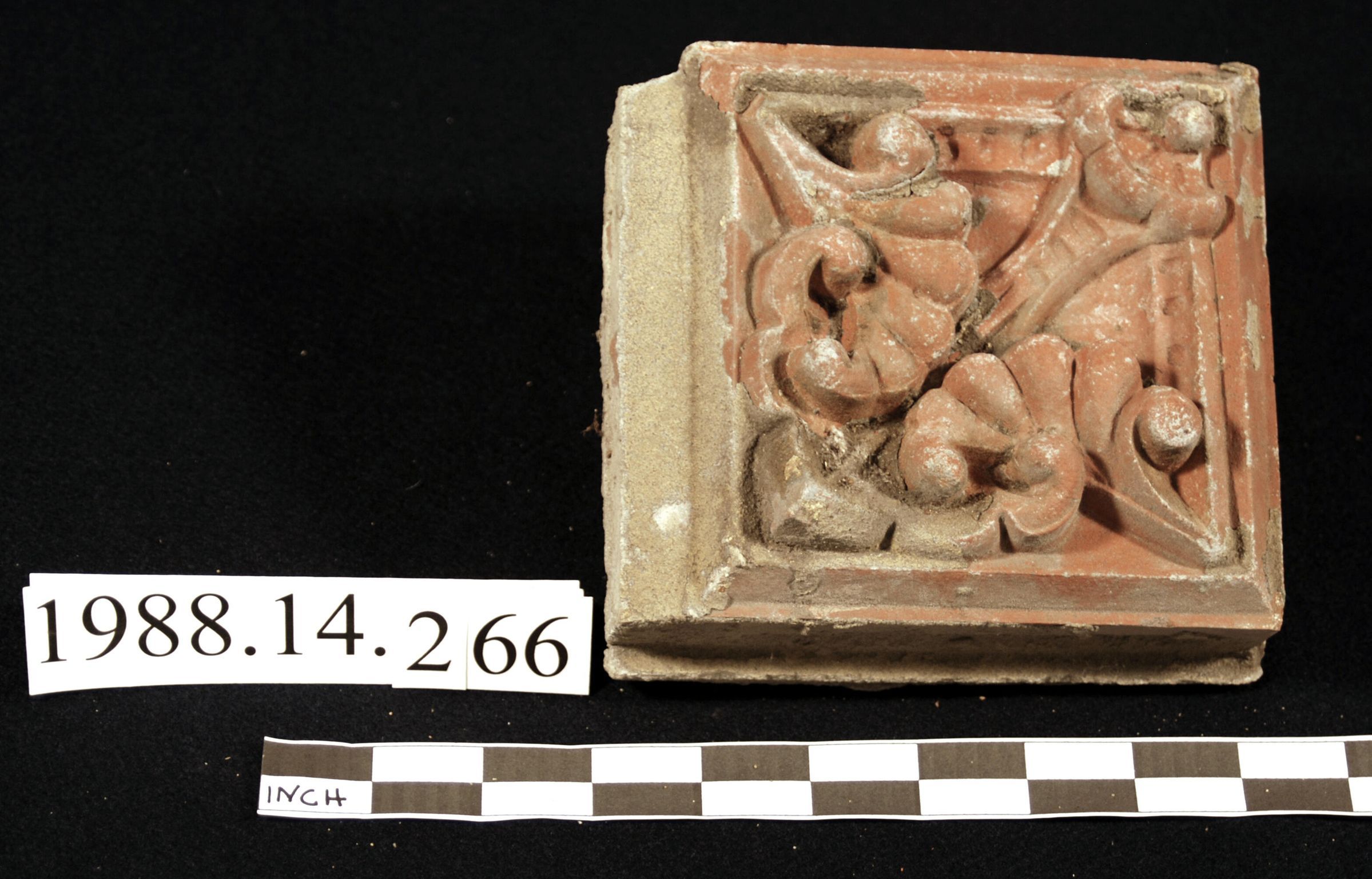 Molded red unglazed terra cotta block. Approximately 6 inch by 6 inch module. Botanical motif. Remnants of layers of paint (yellow and brown). Reverse is hollow. Filled with mortar. Originally mounted on brick wall.