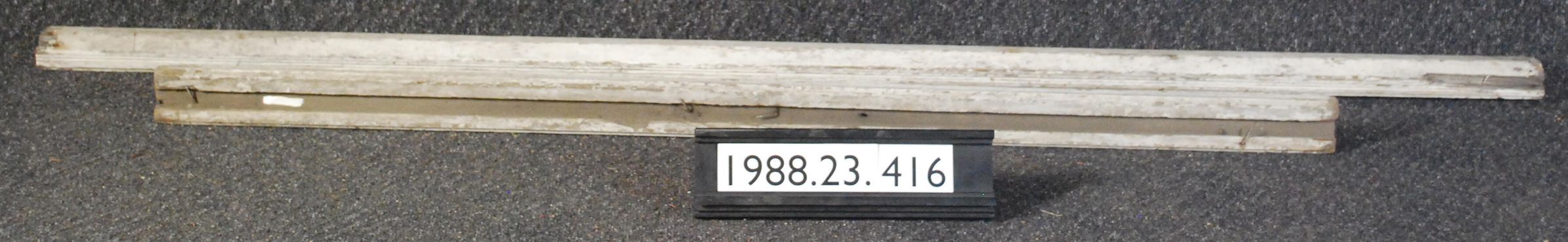 One lot of two exterior wood top handrails, from a porch. Beveled top. Date on bottom edge. Beaded on side edge. Painted white. Inscriptions or Markings: Manufacturer: Place of Manufacturer: Design motif: Style: Finish: Painted White
