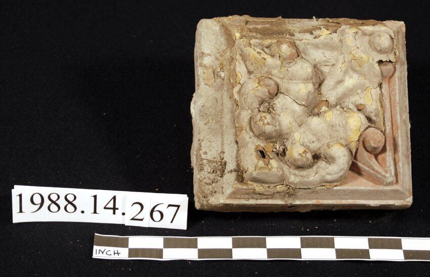 Molded red unglazed terra cotta block. Approximately 6 inch by 6 inch module. Botanical motif. Remnants of layers of paint (yellow and brown). Reverse is hollow. Filled with mortar. Originally mounted on brick wall.