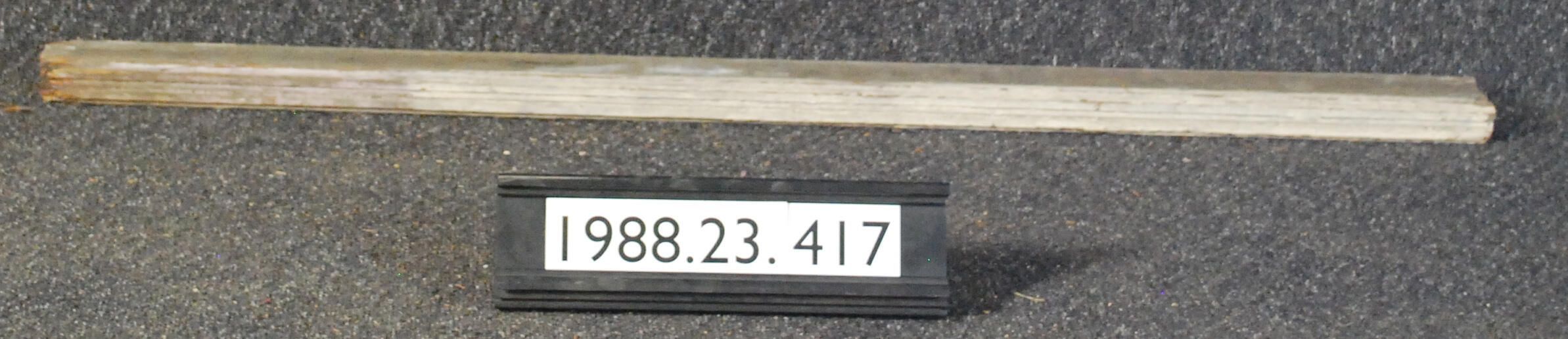 Exterior wood rail from porch. Remnants of beige and green paint. Inscriptions or Markings: Manufacturer: Place of Manufacturer: Design motif: Style: Finish: Remnants of Beige and Green Paint