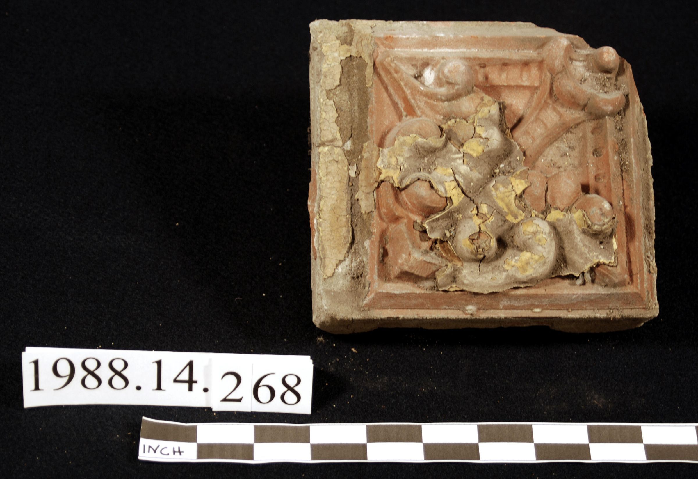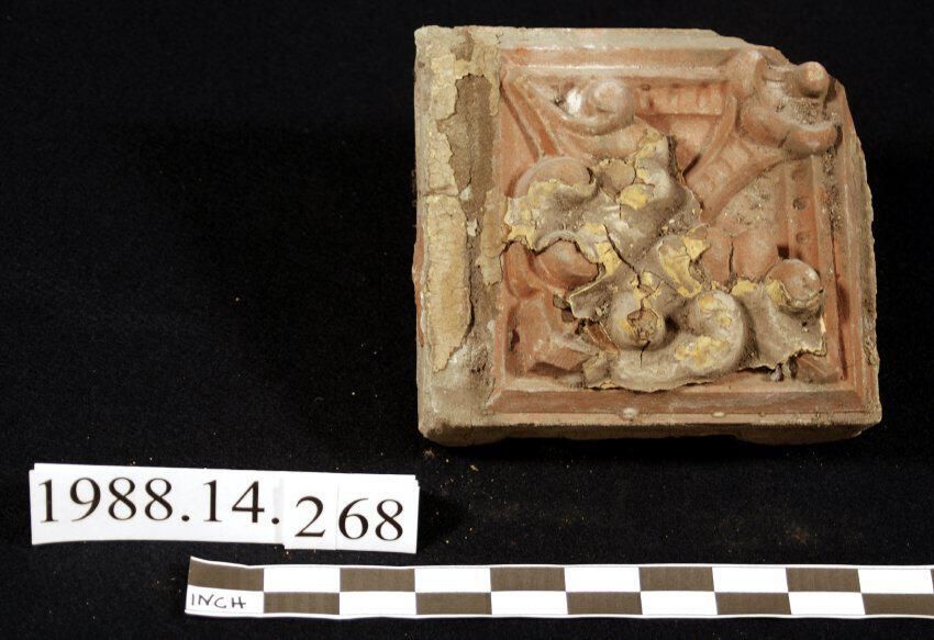 Molded red unglazed terra cotta block. Approximately 6 inch by 6 inch module. Broken corner. Botanical motif. Remnants of layers of paint (yellow and brown). Reverse is hollow. Filled with mortar. Originally mounted on brick wall.