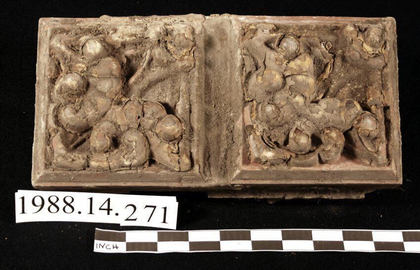 Molded red unglazed terra cotta block. Approximately 6 inch by 6 inch module. Connected together. Botanical motif. Remnants of layers of paint (yellow and brown). Reverse is hollow. Filled with mortar. Originally mounted on brick wall.