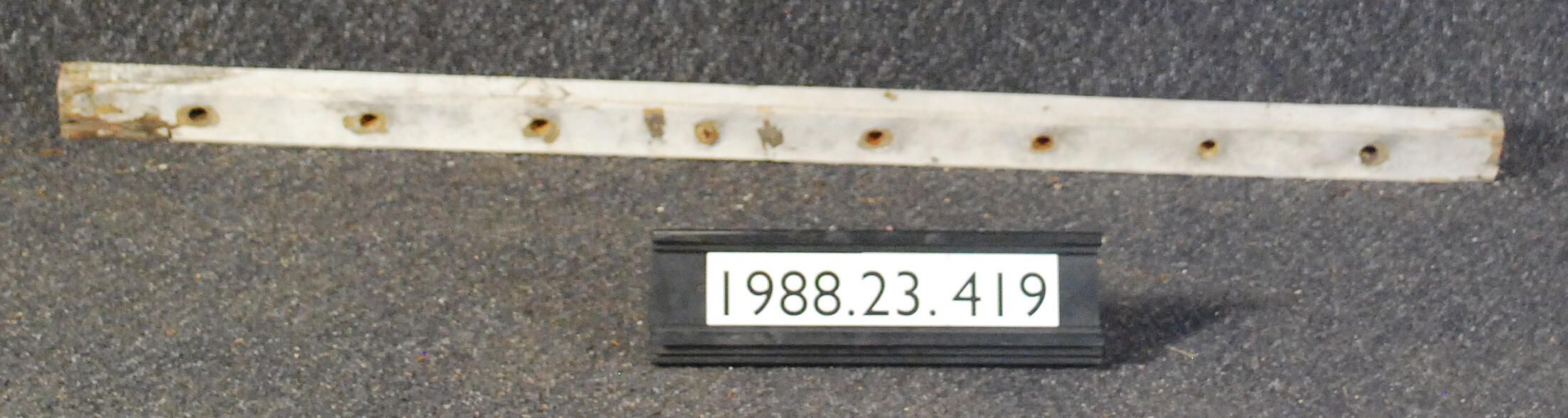 Exterior wood rail with equidistant drilled round holes. Painted white. Inscriptions or Markings: Manufacturer: Place of Manufacturer: Design motif: Style: Finish: Painted White