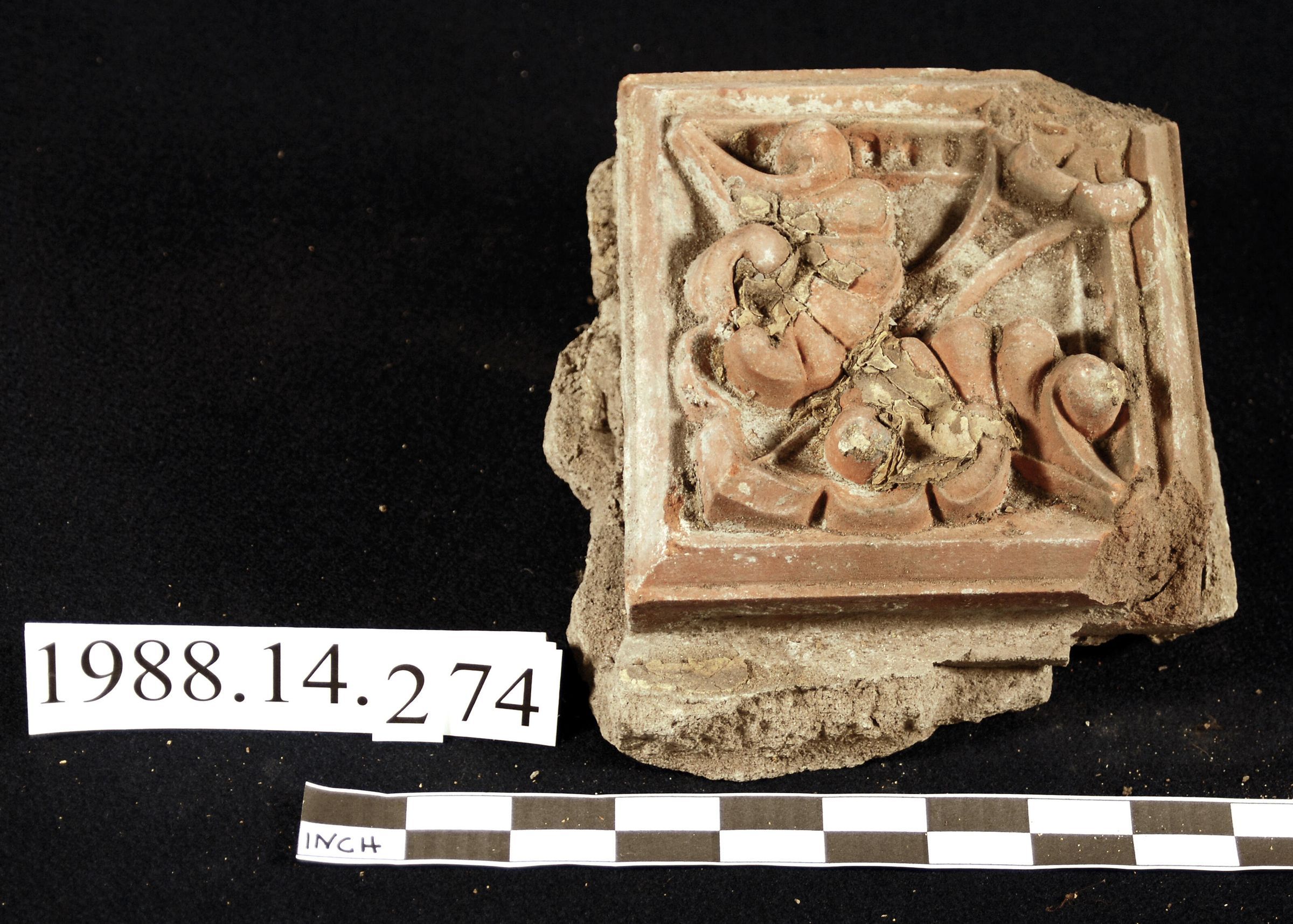 Molded red unglazed terra cotta block. Approximately 6 inch by 6 inch module. Botanical motif. Remnants of layers of paint (yellow and brown). Reverse is hollow, filled with mortar. Originally mounted on brick wall.