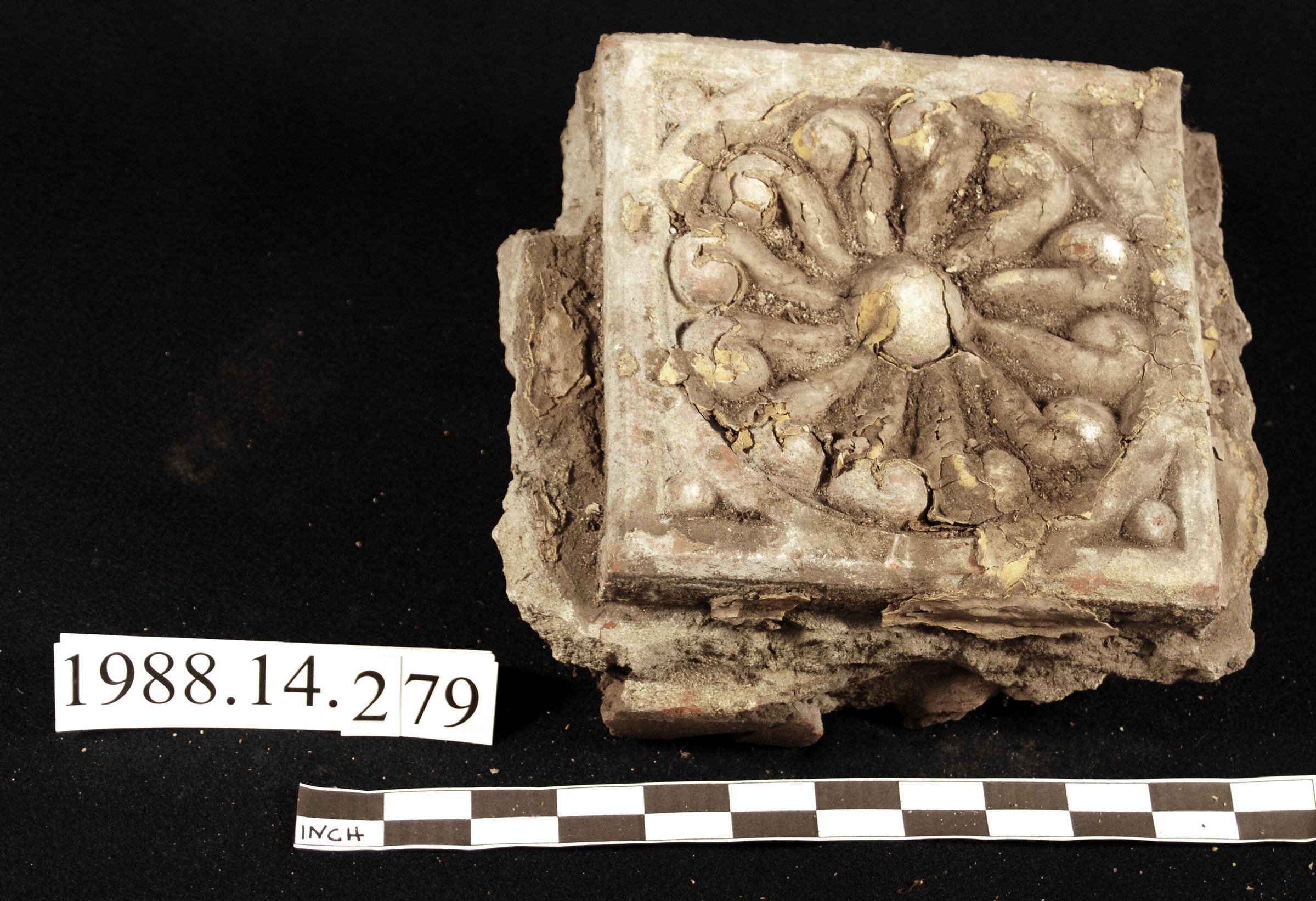 Molded red unglazed terra cotta block. Approximately 7.5 inch by 7.5 inch module. Central rosette. Remnants of layers of paint (yellow and brown). Reverse covered with mortar and brick.