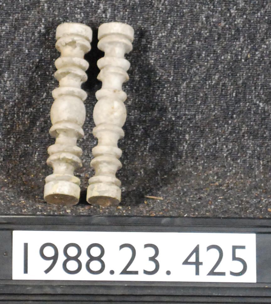 One lot of two exterior wood turned spindles. Painted off-white. Inscriptions or Markings: Manufacturer: Place of Manufacturer: Design motif: Style: Finish: Painted Off-White