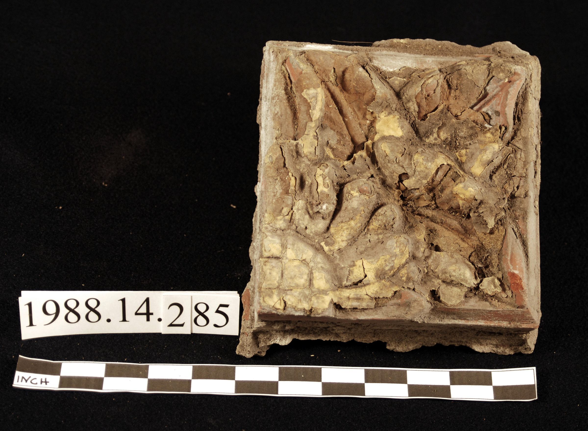 Molded red unglazed terra cotta block. Approximately 6.5 inch by 6.5 inch module. Floral / botanical motif. Remnants of layers of paint (yellow). Reverse covered with mortar. Originally mounted on brick wall.