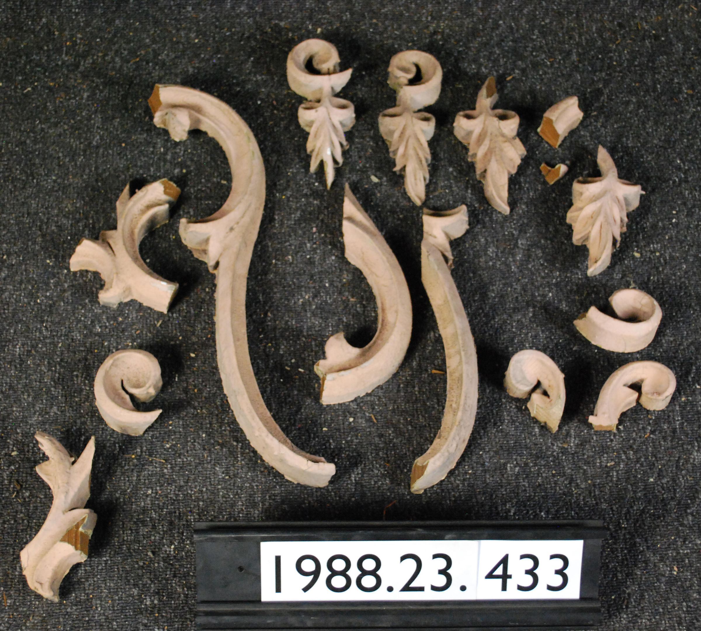 One lot of fifteen exterior wood carved ornaments. Fragments painted pink. Inscriptions or Markings: Manufacturer: Place of Manufacturer: Design motif: Style: Finish: Fragments Painted Pink