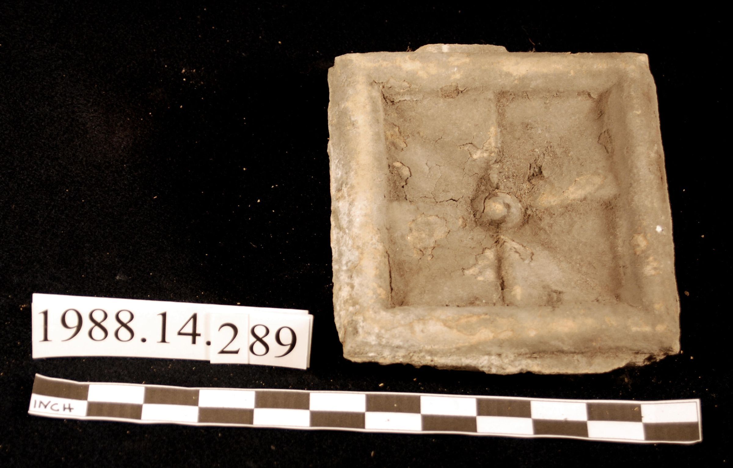 Molded Portland cement block. Approximately 6.5 inch by 6.5 inch module. Square with square geometric concave motif. Multi-layers of paint. Originally mounted on brick wall.