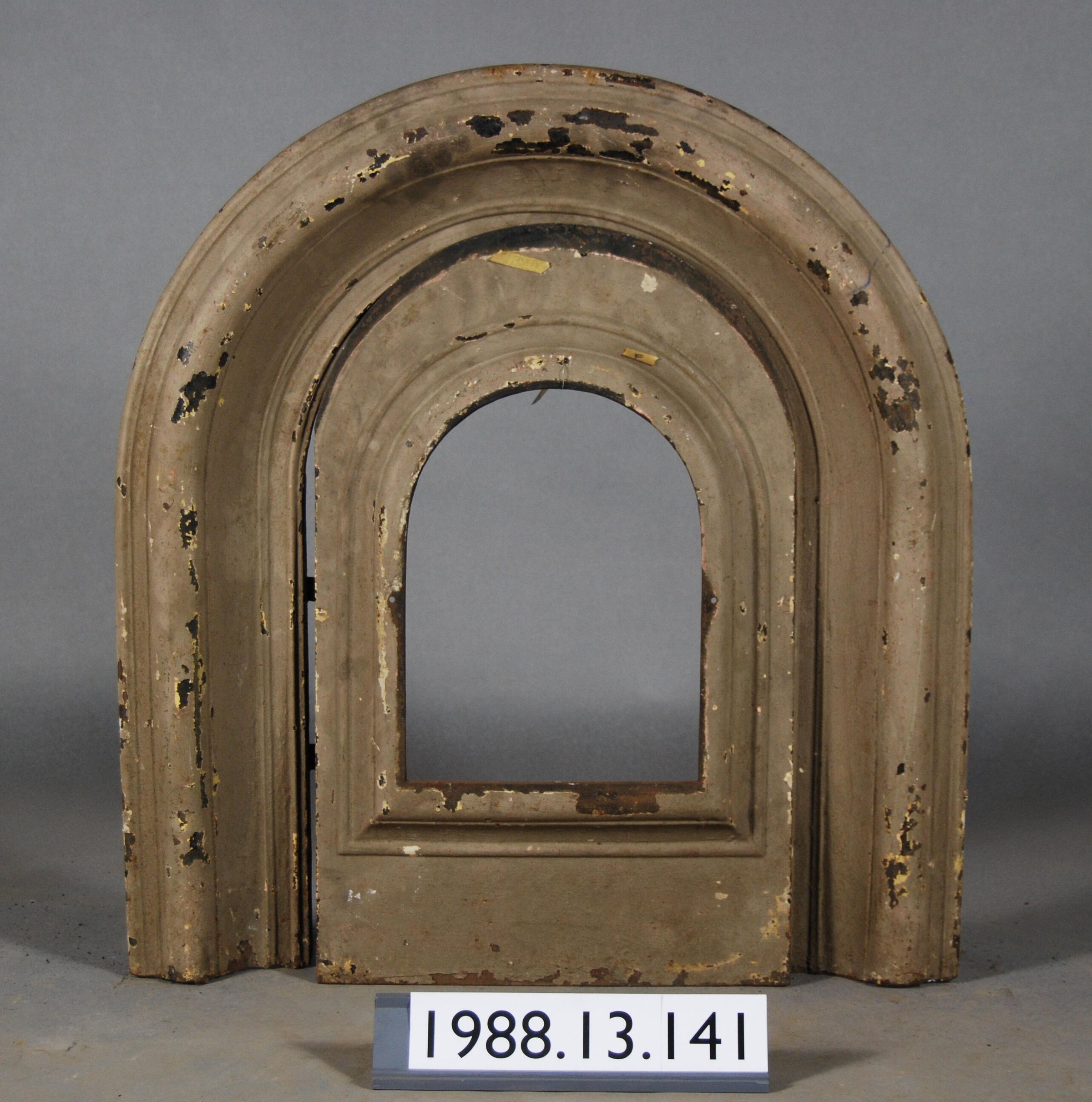 Cast iron. Fireplace frame. Arched top. Compound molded edges. Has arched cover with opening. Missing central register grille. Originally painted black. Over-painted brown.
