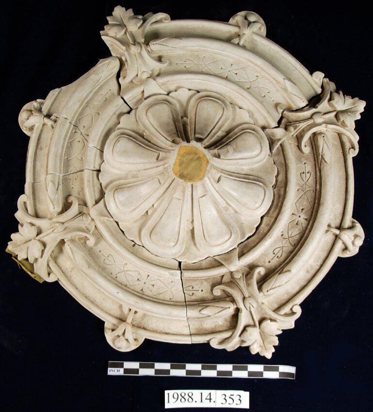 Historic plaster circular ceiling medallion. Central hole. Missing center piece. Center of medallion has rosette. Circular surround has band with geometric incised aesthetic decoration outer perimeter. Outer perimeter has appendages with alternating leaf / scroll and floral bud motif. All parts have been stripped and repainted white. Reverse has incised score marks.