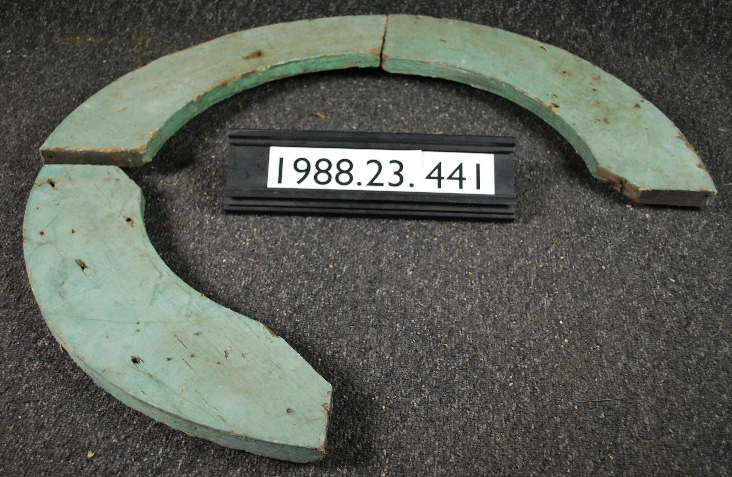 One lot of three semi-circular segments. Probably window casings. Painted green. Inscriptions or Markings: Manufacturer: Place of Manufacturer: Design motif: Style: Finish: Painted Green