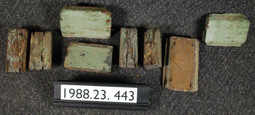One lot of eight exterior wood fragments. Undetermined functions (probably porch parts). Painted Green.