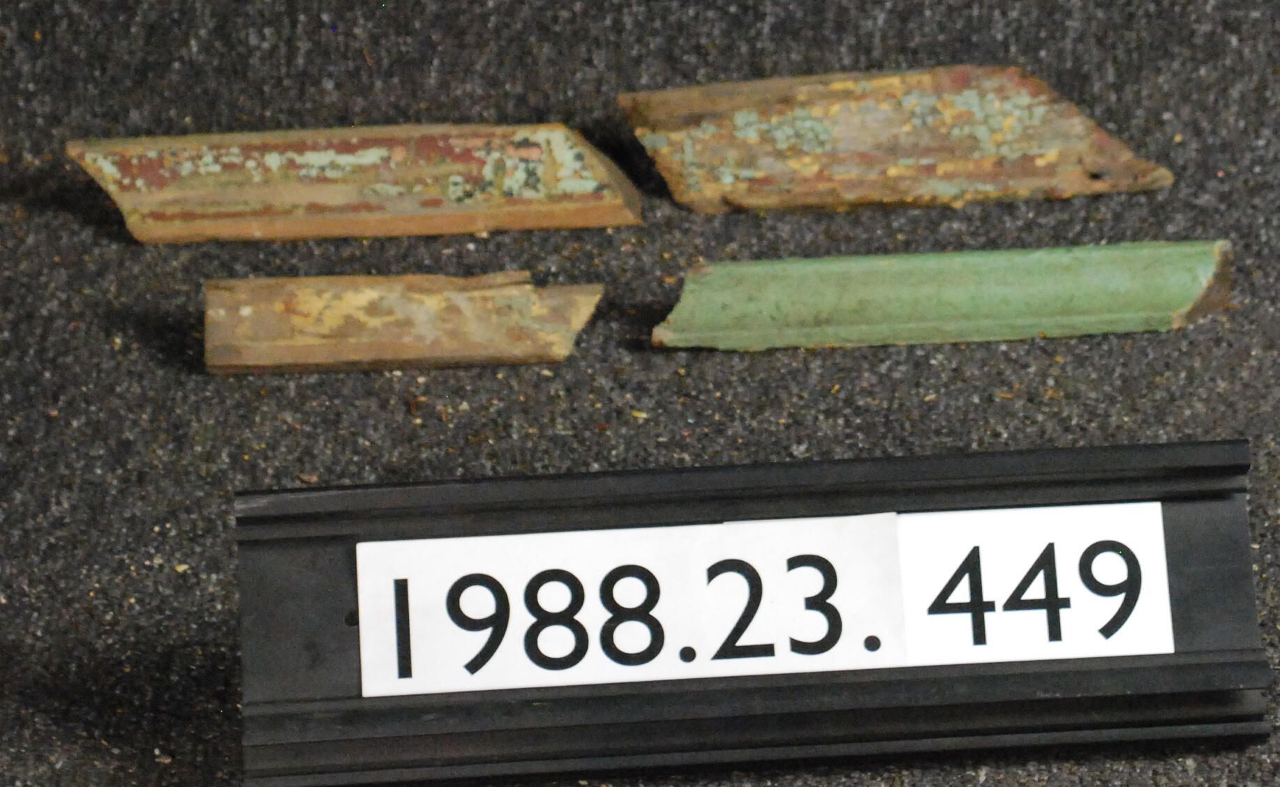 One lot of four moldings. Various profiles. Remnants of green paint. Inscriptions or Markings: Manufacturer: Place of Manufacturer: Design motif: Style: Finish: Remnants of Green Paint