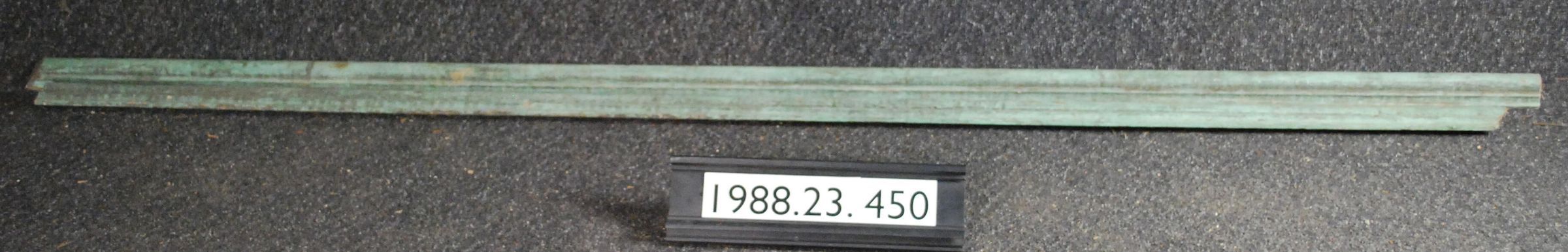 One lot of two exterior wood moldings. Painted green. Inscriptions or Markings: Manufacturer: Place of Manufacturer: Design motif: Style: Finish: Painted Green